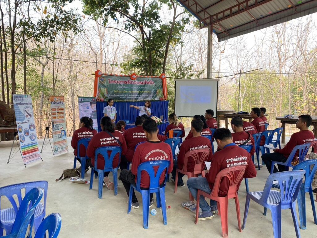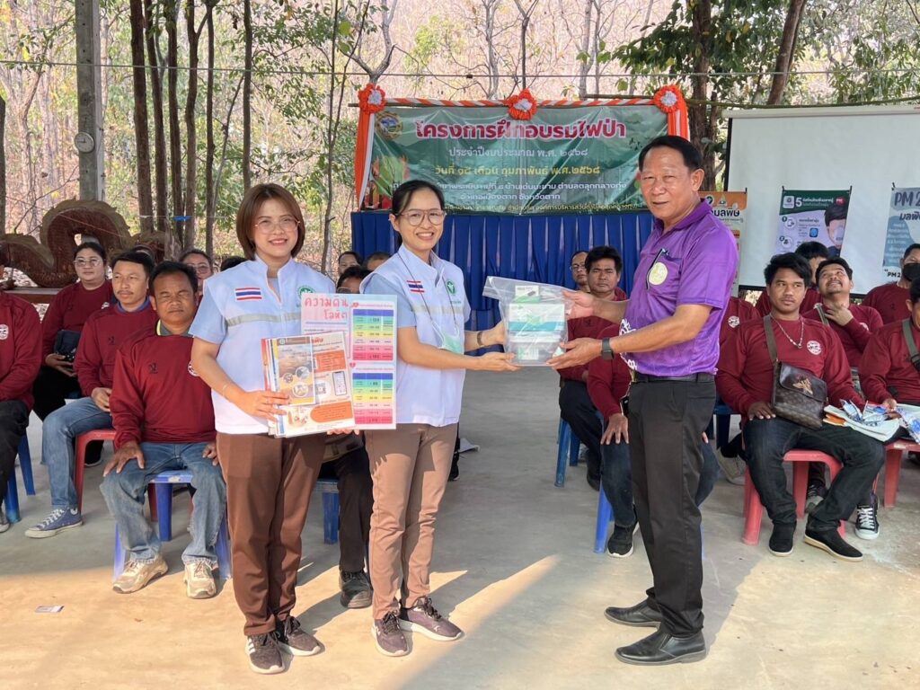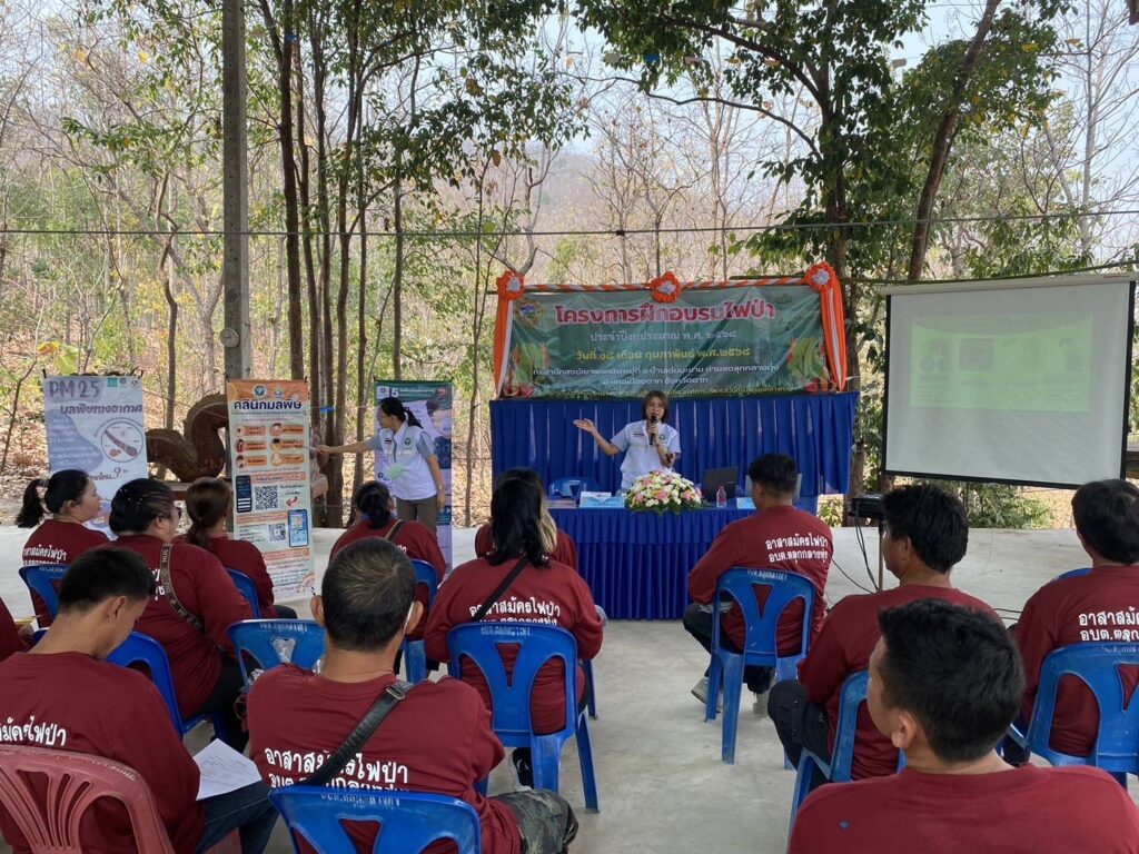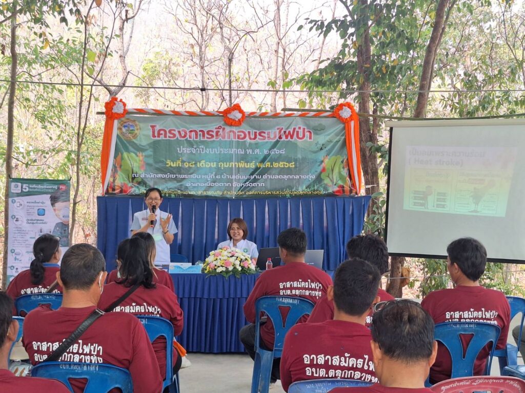วันที่ 18 กุมภาพันธ์ 2568 นพ.บรรเจิด นนทสูติ ผู้อำนวยการโรงพยาบาลสมเด็จพระเจ้าตากสินมหาราช มอบหมายให้ กลุ่มงานอาชีวเวชกรรม ร่วมกับศูนย์ส่งเสริมการควบคุมไฟป่าตาก ออกหน่วยบริการอาชีวอนามัยเชิงรุก แก่อาสาสมัครป้องกันไฟป่า (อส.ฟป) โดยเนื้อหาการอบรมประกอบด้วย กฎหมายของป่าไม้ การเข้าระงับเหตุไฟป่า การใช้อุปกรณ์ การจัดทำแนวกันไฟ การให้ความรู้เกี่ยวกับสถานการณ์ฝุ่นละอองขนาดเล็ก (PM2.5) ให้คำแนะนำในการดูแลสุขภาพ การปฏิบัติตัวเพื่อป้องกันอันตราย/ลดการสัมผัสฝุ่นละออง PM2.5 อันตรายจากไฟป่า การปฐมพยาบาลเบื้องต้น ประชาสัมพันธ์คลินิกมลพิษ/คลินิกมลพิษออนไลน์ (รพ.สมเด็จพระเจ้าตากสินมหาราช) มอบชุดปฐมพยาบาล หน้ากากอนามัย และเครื่องวัดออกซิเจนในเลือด แก่งานป้องกันและบรรเทาสาธารณภัย องค์การบริหารส่วนตำบลตลุกกลางทุ่ง ในโครงการฝึกอบรมไฟป่า ประจำปีงบประมาณ 2568 ซึ่งเป็นกำลังสนับสนุนเจ้าพนักงานในการควบคุมไฟป่า ณ สำนักสงฆ์เขาพระเมิน หมู่ที่8 บ้านเด่นมะขาม ตำบลตลุกกลางทุ่ง โดยมีผู้เข้าร่วมการอบรม จำนวน 25 คน รวมไปถึง ให้คำแนะนำแนวทางการจัดทำ ห้องปลอดฝุ่น มอบสื่อความรู้และหน้ากากอนามัยสำหรับเด็กเล็ก จำนวน 100 ชิ้น แก่เด็กและบุคลากร ณ ศูนย์พัฒนาเด็กเล็กองค์การบริหารส่วนตำบลตลุกกลางทุ่ง ตำบลตลุกกลางทุ่ง อำเภอเมืองตาก จังหวัดตาก