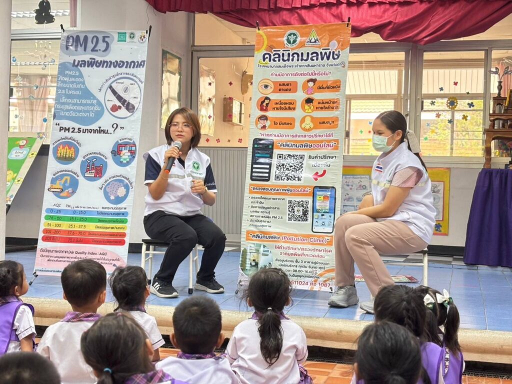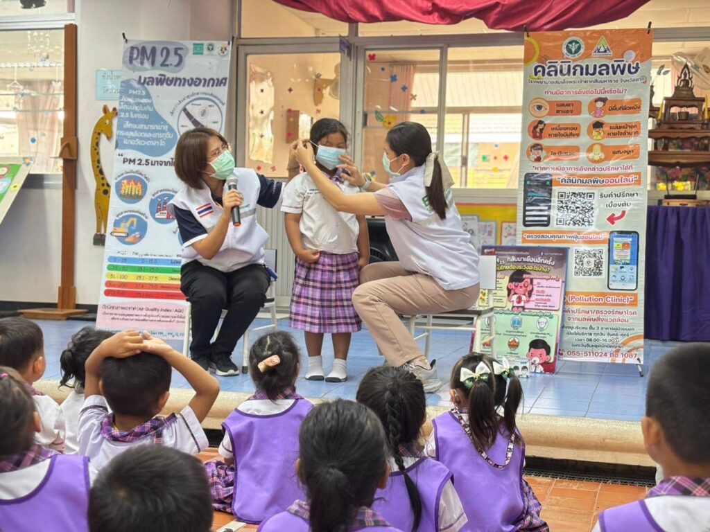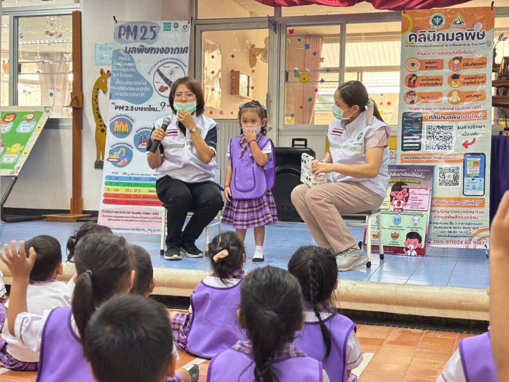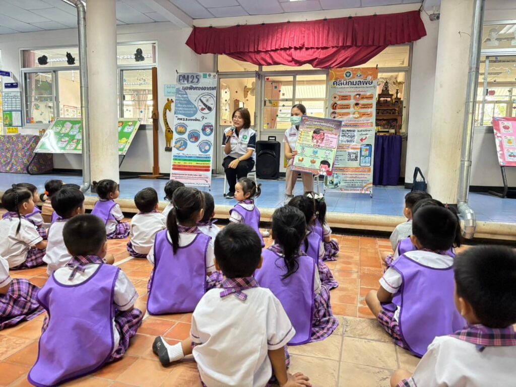 วันที่ 20 กุมภาพันธ์ 2568 นพ.บรรเจิด นนทสูติ ผู้อำนวยการโรงพยาบาลสมเด็จพระเจ้าตากสินมหาราช มอบหมายให้กลุ่มงานอาชีวเวชกรรม ออกหน่วยบริการอาชีวอนามัยเชิงรุกให้คำแนะนำในการดูแลสุขภาพ การปฏิบัติตัวเพื่อป้องกันอันตราย การปฐมพยาบาลเบื้องต้นกรณีเลือดกำเดาไหล การลดการสัมผัสฝุ่นละอองPM2.5 ประชาสัมพันธ์คลินิกมลพิษ คลินิกมลพิษออนไลน์ (รพ.สมเด็จพระเจ้าตากสินมหาราช) ให้คำแนะนำแนวทางการจัดทำห้องปลอดฝุ่นศูนย์พัฒนาเด็กเล็ก รวมไปถึงมอบสื่อความรู้และหน้ากากอนามัยสำหรับเด็กเล็ก จำนวน 100 ชิ้น แก่เด็กนักเรียน จำนวนทั้งสิ้น 36 คน ณ ศูนย์พัฒนาเด็กเล็กเทศบาล 3 วัดชัยชนะสงคราม อำเภอเมืองตาก จังหวัดตาก
