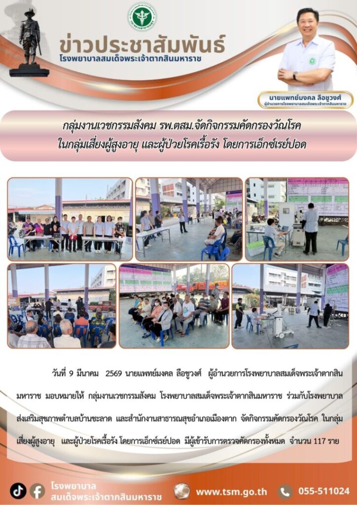 วันที่ 9 มีนาคม 2569 นายแพทย์มงคล ลือชูวงศ์ ผู้อำนวยการโรงพยาบาลสมเด็จพระเจ้าตากสินมหาราช มอบหมายให้ กลุ่มงานเวชกรรมสังคม โรงพยาบาลสมเด็จพระเจ้าตากสินมหาราช ร่วมกับโรงพยาบาล ส่งเสริมสุขภาพตำบลบ้านชะลาด และสำนักงานสาธารณสุขอำเภอเมืองตาก จัดกิจกรรมคัดกรองวัณโรค ในกลุ่มเสี่ยงผู้สูงอายุ และผู้ป่วยโรคเรื้อรัง โดยการเอ็กซ์เรย์ปอด มีผู้เข้ารับการตรวจคัดกรองทั้งหมด จำนวน 117 ราย