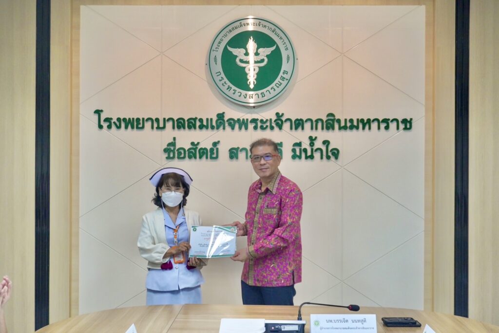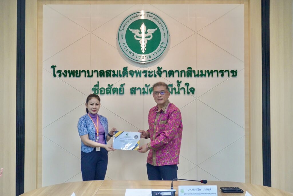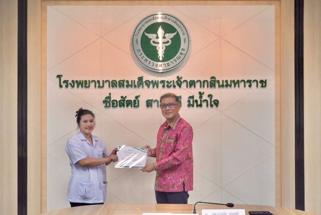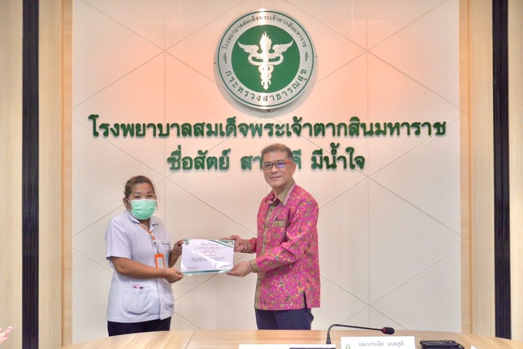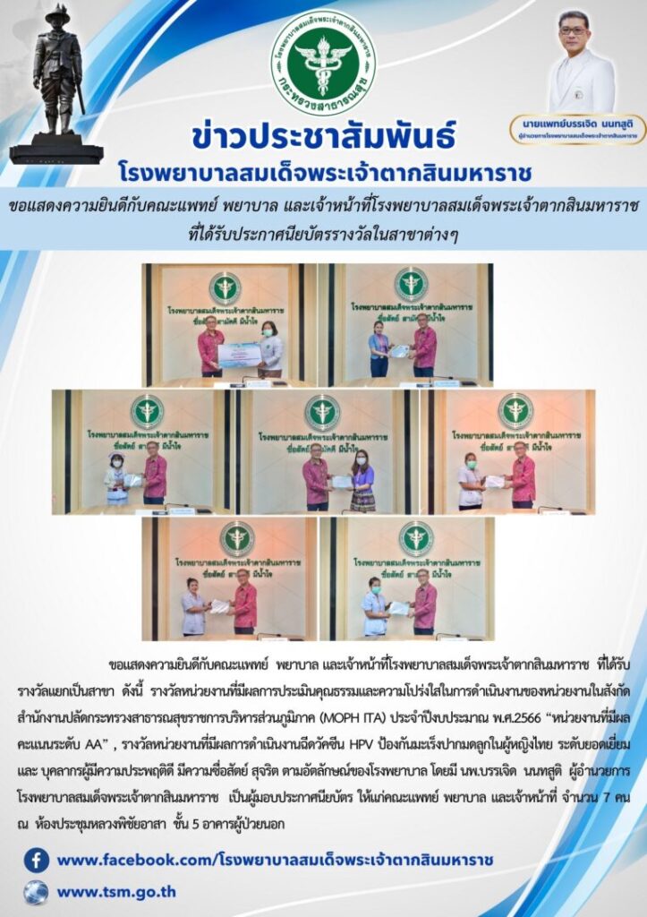 ขอแสดงความยินดีกับคณะแพทย์ พยาบาล และเจ้าหน้าที่โรงพยาบาลสมเด็จพระเจ้าตากสินมหาราช ที่ได้รับรางวัลแยกเป็นสาขา ดังนี้ รางวัลหน่วยงานที่มีผลการประเมินคุณธรรมและความโปร่งใสในการดำเนินงานของหน่วยงานในสังกัดสำนักงานปลัดกระทรวงสาธารณสุขราชการบริหารส่วนภูมิภาค (MOPH ITA) ประจำปีงบประมาณ พ.ศ.2566 “หน่วยงานที่มีผลคะแนนระดับ AA” , รางวัลหน่วยงานที่มีผลการดำเนินงานฉีดวัคซีน HPV ป้องกันมะเร็งปากมดลูกในผู้หญิงไทย ระดับยอดเยี่ยม และ บุคลากรผู้มีความประพฤติดี มีความซื่อสัตย์ สุจริต ตามอัตลักษณ์ของโรงพยาบาล โดยมี นพ.บรรเจิด นนทสูติ ผู้อำนวยการโรงพยาบาลสมเด็จพระเจ้าตากสินมหาราช เป็นผู้มอบประกาศนียบัตร ให้แก่คณะแพทย์ พยาบาล และเจ้าหน้าที่ จำนวน 7 คน ณ ห้องประชุมหลวงพิชัยอาสา ชั้น 5 อาคารผู้ป่วยนอก