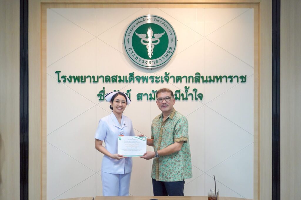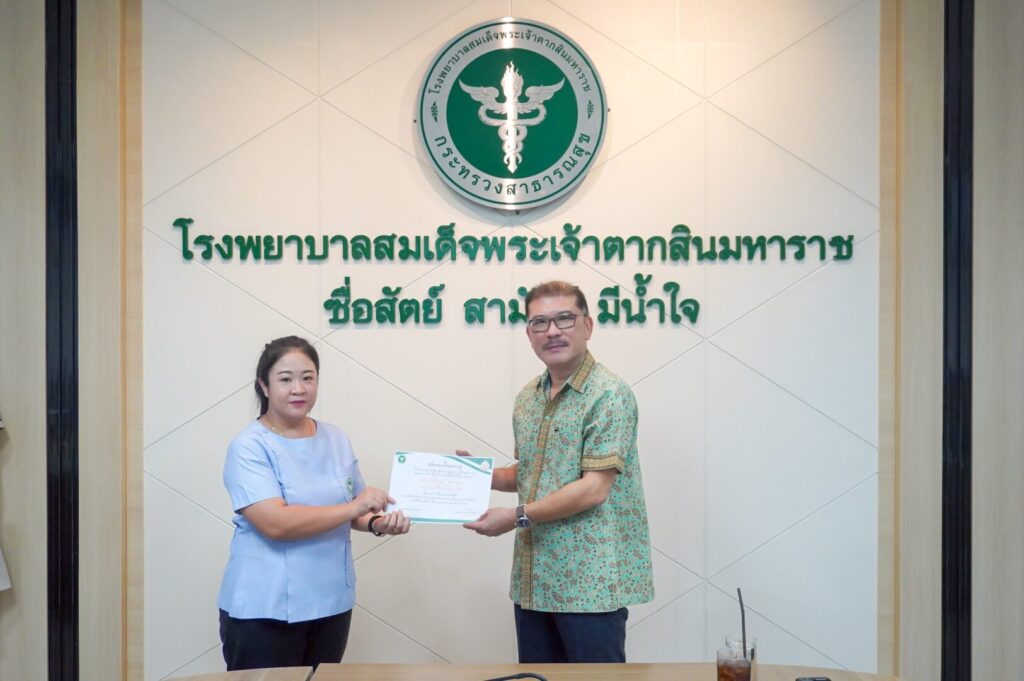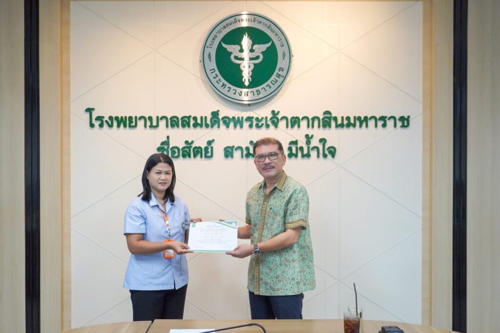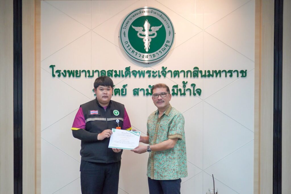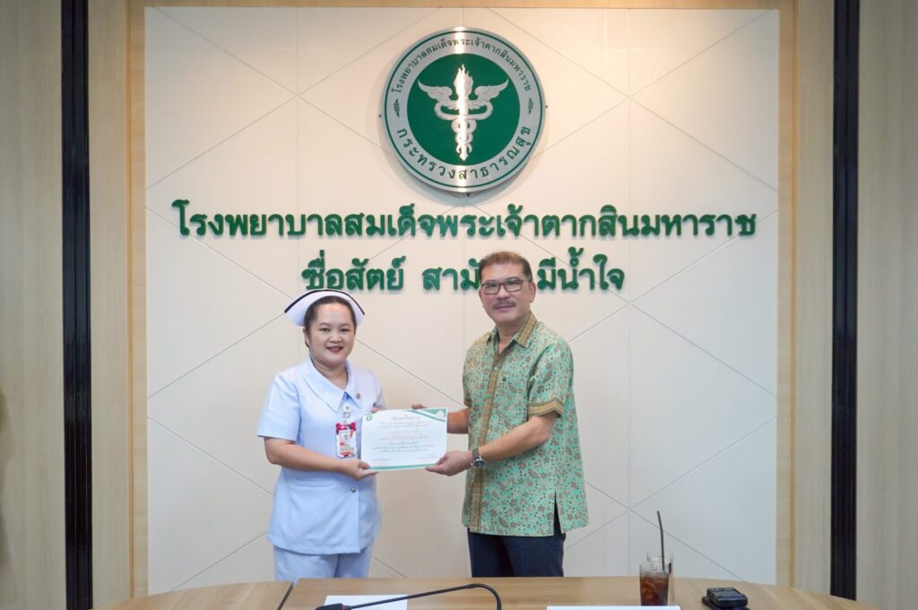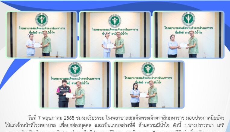 วันที่ 7 พฤษภาคม 2568 ชมรมจริยธรรม โรงพยาบาลสมเด็จพระเจ้าตากสินมหาราช มอบประกาศนียบัตร ให้แก่เจ้าหน้าที่โรงพยาบาล เพื่อยกย่องบุคคล และเป็นแบบอย่างที่ดี ด้านความมีน้ำใจ ดังนี้ 1.นางปรารถนา เต๋ทิ พยาบาลวิชาชีพชำนาญการพิเศษ ช่วยเหลือผู้ประสบอุบัติเหตุ บนท้องถนน 2.นางสาวมณีรัตน์ ยิ้มแย้ม พยาบาลวิชาชีพชำนาญการ ช่วย CPR ผู้ป่วยหยุดหายใจ นอกเวลาราชการ หน้าอาคารนิติเวชแล้วนำส่งตึกอุบัติเหตุ และฉุกเฉิน 3.นางสาวนพวรรณ เงินแย้ม พยาบาลวิชาชีพชำนาญการ ช่วย CPR ผู้ป่วยหยุดหายใจ นอกเวลาราชการ หน้าอาคารนิติเวชแล้วนำส่งตึกอุบัติเหตุและฉุกเฉิน 4.นางสาวปิยนุช ทองหล่อ พนักงานช่วยเหลือคนไข้ ช่วยกันทำความสะอาดบริเวณคลินิกหมอครอบครัวตลาดกลาง 5.นางสุภาพร สัจจโสภิต พนักงานช่วยเหลือคนไข้ ช่วยกันทำความสะอาดบริเวณคลินิกหมอครอบครัวตลาดกลาง 6.นางสาวทิพานันท์ ส่งต่าย พนักงานช่วยเหลือคนไข้ ช่วย CPR ผู้ป่วยหยุดหายใจ นอกเวลาราชการ 7.นายพงศกรณ์ กันทา พนักงานบริการ ดูแลผู้ป่วยระหว่างรอรถมารับกลับบ้านอย่างต่อเนื่อง จำนวน 7 คน โดยมีนพ.บรรเจิด นนทสูติ ผู้อำนวยการโรงพยาบาลสมเด็จพระเจ้าตากสินมหาราช เป็นผู้มอบ ณ ห้องประชุมหลวงพิชัยอาสา ชั้น 5 อาคารผู้ป่วยนอก
