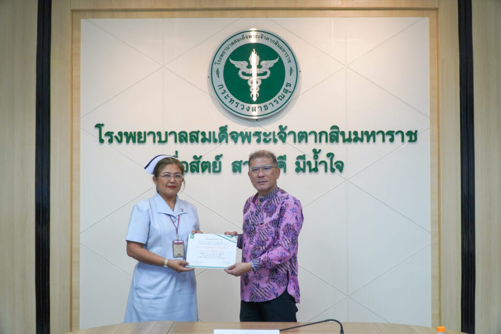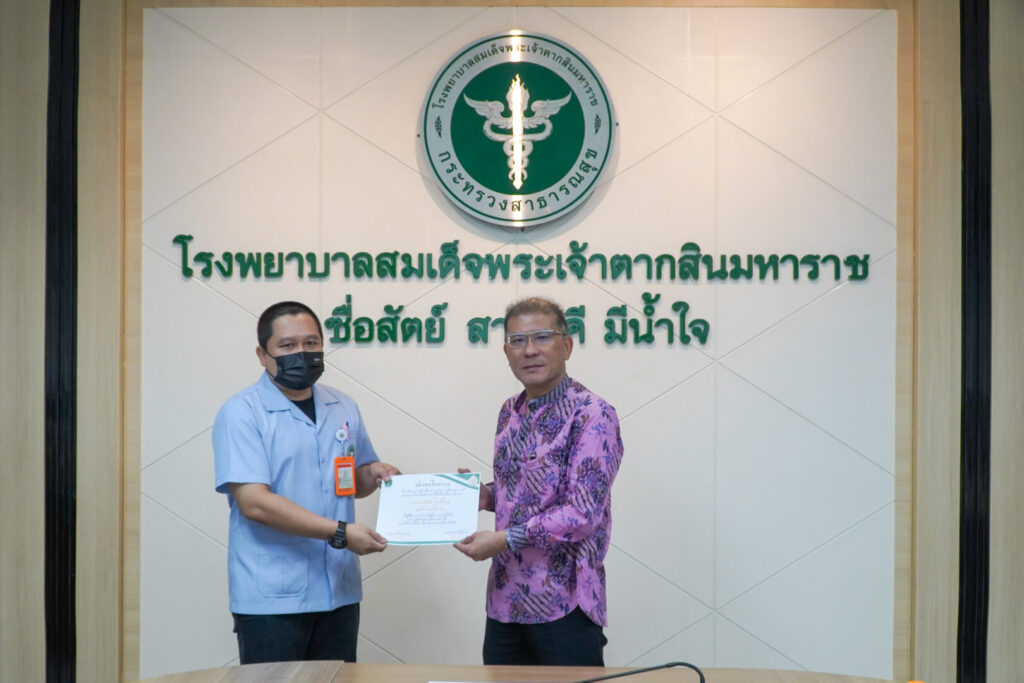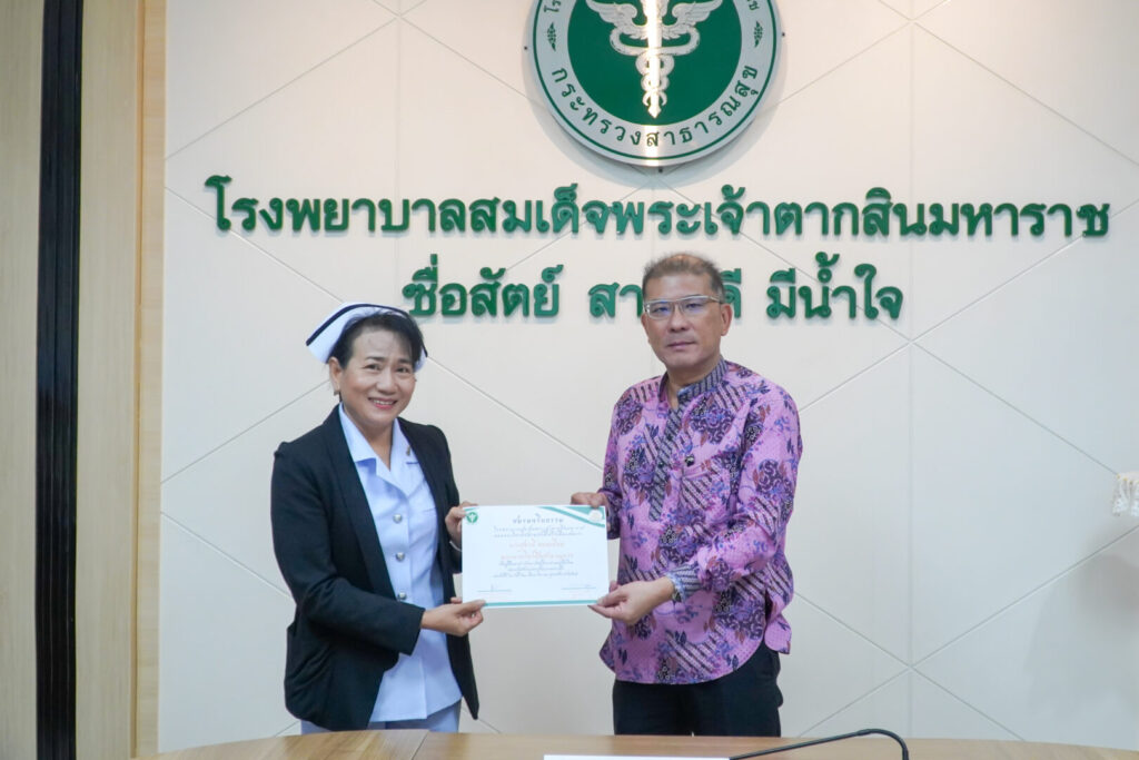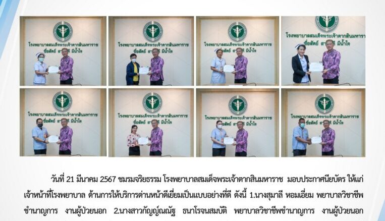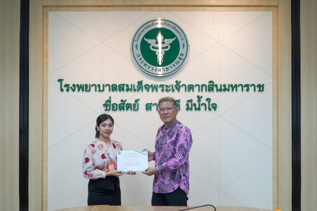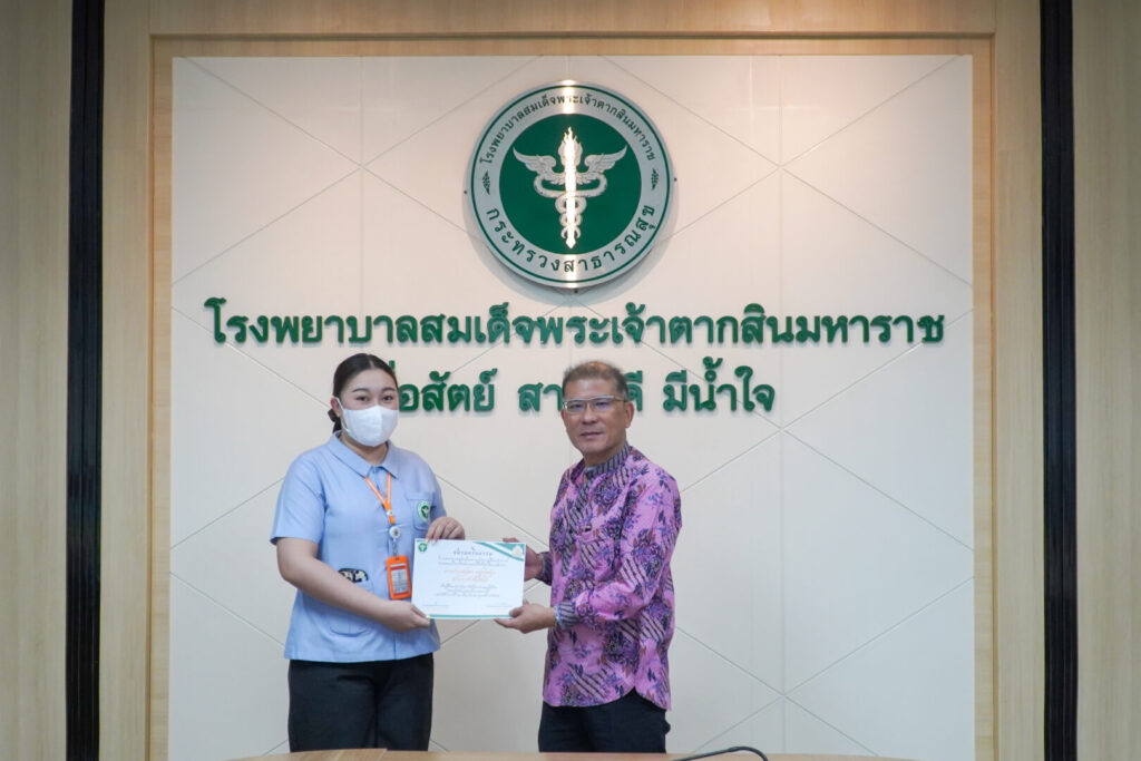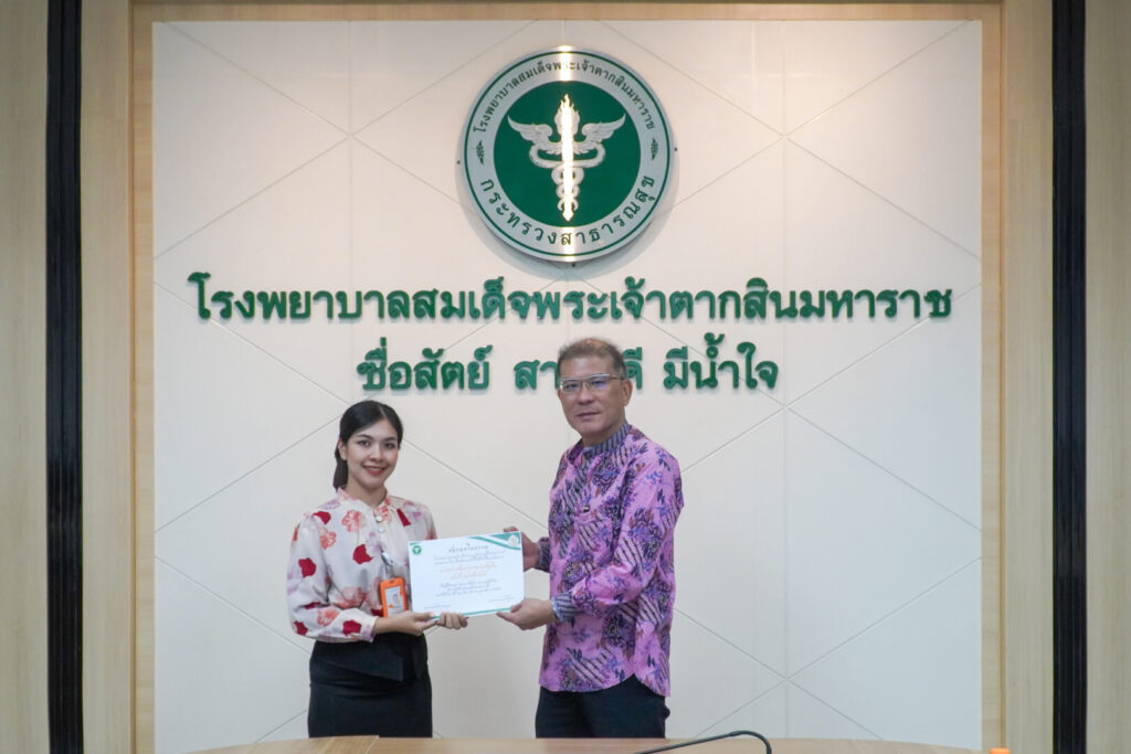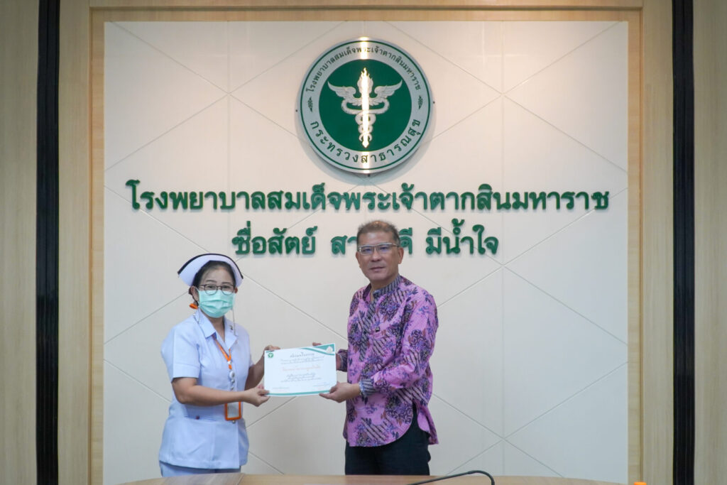 วันที่ 21 มีนาคม 2567 ชมรมจริยธรรม โรงพยาบาลสมเด็จพระเจ้าตากสินมหาราช มอบประกาศนียบัตร ให้แก่ เจ้าหน้าที่โรงพยาบาล ด้านการให้บริการด่านหน้าดีเยีี่ยมเป็นแบบอย่างที่ดี ดังนี้ 1.นางสุมาลี หอมเอี่ยม พยาบาลวิชาชีพชำนาญการ งานผู้ป่วยนอก 2.นางสาวกัญญ์ณณัฐ ธนาโรจนสมบัติ พยาบาลวิชาชีพชำนาญการ งานผู้ป่วยนอก 3.นายธนพัฒน์ วงษ์ใหญ่ พนักงานบริการ งานผู้ป่วยนอก 4.นายจักรี รินรส นักประชาสัมพันธ์ งานประชาสัมพันธ์ 5.นางสาวณัฐพร อยู่เลิศลบ นักประชาสัมพันธ์ งานประชาสัมพันธ์ 6.นางสาวปัทมวรรณ แช่มชื่น นักประชาสัมพันธ์ งานประชาสัมพันธ์ 7.ทีมแพทย์พยาบาล เจ้าหน้าที กลุ่มงานอุบัติเหตุ-ฉุกเฉิน 8.ทีมแพทย์พยาบาล กลุ่มงานไตเทียม และ 9.นายนที หลงหมี พนักงานบริการ ฝ่ายบริหาร เก็บสร้อยข้อมือทองคำ ส่งคืนเจ้าของ โดยมอบประกาศนียบัตรฉบับนี้ เพื่อยกย่องบุคลากรผู้มีความประพฤติดี มีความซื่อสัตย์ สุจริต ตามอัตลักษณ์ของโรงพยาบาล โดยมี นพ.บรรเจิด นนทสูติ ผู้อำนวยการโรงพยาบาลสมเด็จพระเจ้าตากสินมหาราช เป็นผู้มอบ ณ ห้องประชุมหลวงพิชัยอาสา ชั้น 5 อาคารผู้ป่วยนอก