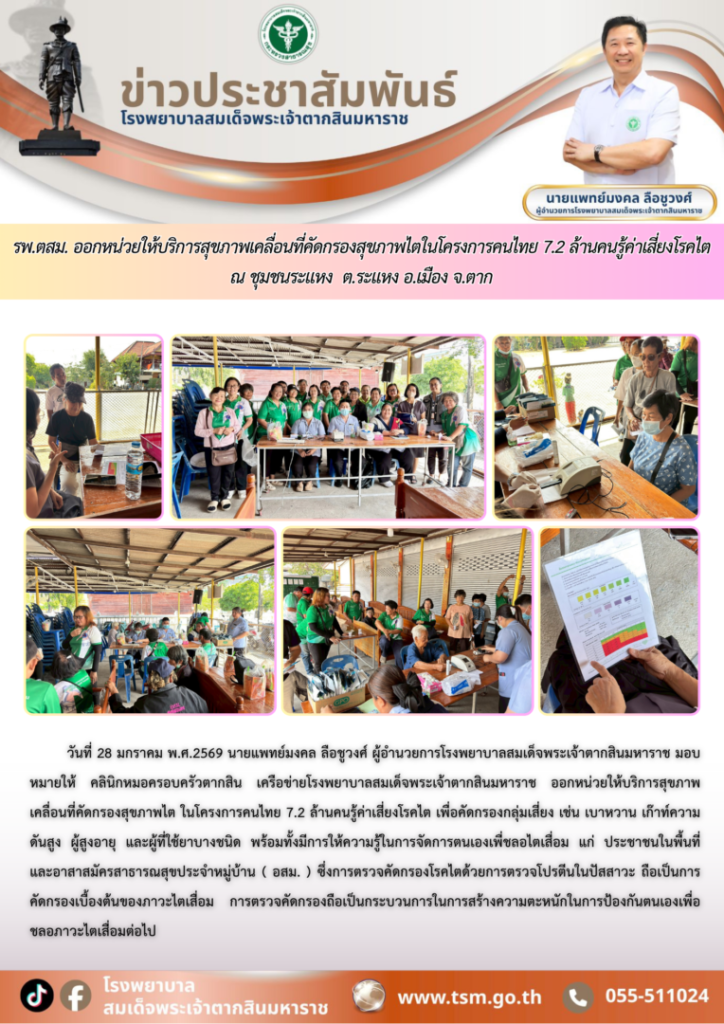วันที่ 28 มกราคม พ.ศ.2569 นายแพทย์มงคล ลือชูวงศ์ ผู้อำนวยการโรงพยาบาลสมเด็จพระเจ้าตากสินมหาราช มอบหมายให้ คลินิกหมอครอบครัวตากสิน เครือข่ายโรงพยาบาลสมเด็จพระเจ้าตากสินมหาราช ออกหน่วยให้บริการสุขภาพเคลื่อนที่คัดกรองสุขภาพไต ในโครงการคนไทย 7.2 ล้านคนรู้ค่าเสี่ยงโรคไต เพื่อคัดกรองกลุ่มเสี่ยง เช่น เบาหวาน เก๊าท์ความดันสูง ผู้สูงอายุ และผู้ที่ใช้ยาบางชนิด พร้อมทั้งมีการให้ความรู้ในการจัดการตนเองเพื่ชลอไตเสื่อม แก่ ประชาชนในพื้นที่ และอาสาสมัครสาธารณสุขประจำหมู่บ้าน (อสม.) ซึ่งการตรวจคัดกรองโรคไตด้วยการตรวจโปรตีนในปัสสาวะถือเป็นการคัดกรองเบื้องต้นของภาวะไตเสื่อม การตรวจคัดกรองถือเป็นกระบวนการในการสร้างความตะหนักในการป้องกันตนเองเพื่อชลอภาวะไตเสื่อมต่อไป