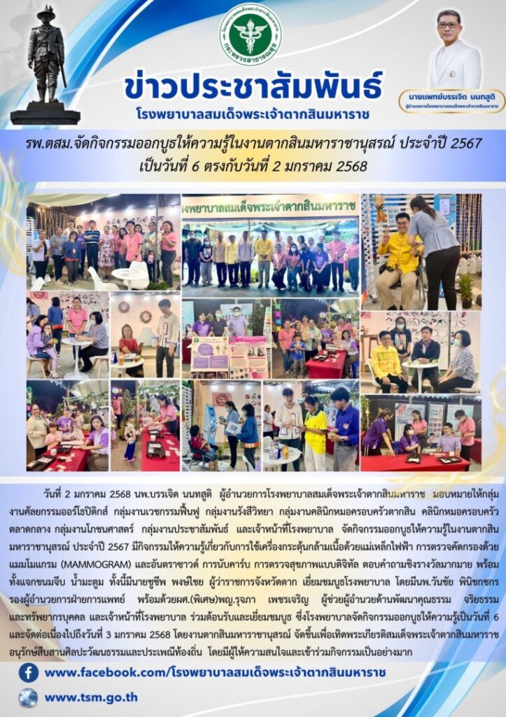 วันที่ 2 มกราคม 2568 นพ.บรรเจิด นนทสูติ ผู้อำนวยการโรงพยาบาลสมเด็จพระเจ้าตากสินมหาราช มอบหมายให้กลุ่มงานศัลยกรรมออร์โธปิดิกส์ กลุ่มงานเวชกรรมฟื้นฟู กลุ่มงานรังสีวิทยา กลุ่มงานคลินิกหมอครอบครัวตากสิน คลินิกหมอครอบครัวตลาดกลาง กลุ่มงานโภชนศาสตร์ กลุ่มงานประชาสัมพันธ์ และเจ้าหน้าที่โรงพยาบาล จัดกิจกรรมออกบูธให้ความรู้ในงานตากสินมหาราชานุสรณ์ ประจำปี 2567 มีกิจกรรมให้ความรู้เกี่ยวกับการใช้เครื่องกระตุ้นกล้ามเนื้อด้วยแม่เหล็กไฟฟ้า การตรวจคัดกรองด้วยแมมโมแกรม (Mammogram) และอันตราซาวด์ การนับคาร์บ การตรวจสุขภาพแบบดิจิทัล ตอบคำถามชิงรางวัลมากมาย พร้อมทั้งแจกขนมจีบ น้ำมะตูม ทั้งนี้มีนายชูชีพ พงษ์ไชย ผู้ว่าราชการจังหวัดตาก เยี่ยมชมบูธโรงพยาบาล โดยมีนพ.วันชัย พินิชกชกร รองผู้อำนวยการฝ่ายการแพทย์ พร้อมด้วยผศ.(พิเศษ)พญ.รุจภา เพชรเจริญ ผู้ช่วยผู้อำนวยด้านพัฒนาคุณธรรม จริยธรรม และทรัพยากรบุคคล และเจ้าหน้าที่โรงพยาบาล ร่วมต้อนรับและเยี่ยมชมบูธ ซึ่งโรงพยาบาลจัดกิจกรรมออกบูธให้ความรู้เป็นวันที่ 6 และจัดต่อเนื่องไปถึงวันที่ 3 มกราคม 2568 โดยงานตากสินมหาราชานุสรณ์ จัดขึ้นเพื่อเทิดพระเกียรติสมเด็จพระเจ้าตากสินมหาราช อนุรักษ์สืบสานศิลปะวัฒนธรรมและประเพณีท้องถิ่น โดยมีผู้ให้ความสนใจและเข้าร่วมกิจกรรมเป็นอย่างมาก