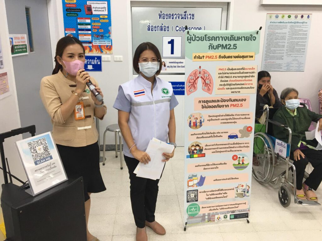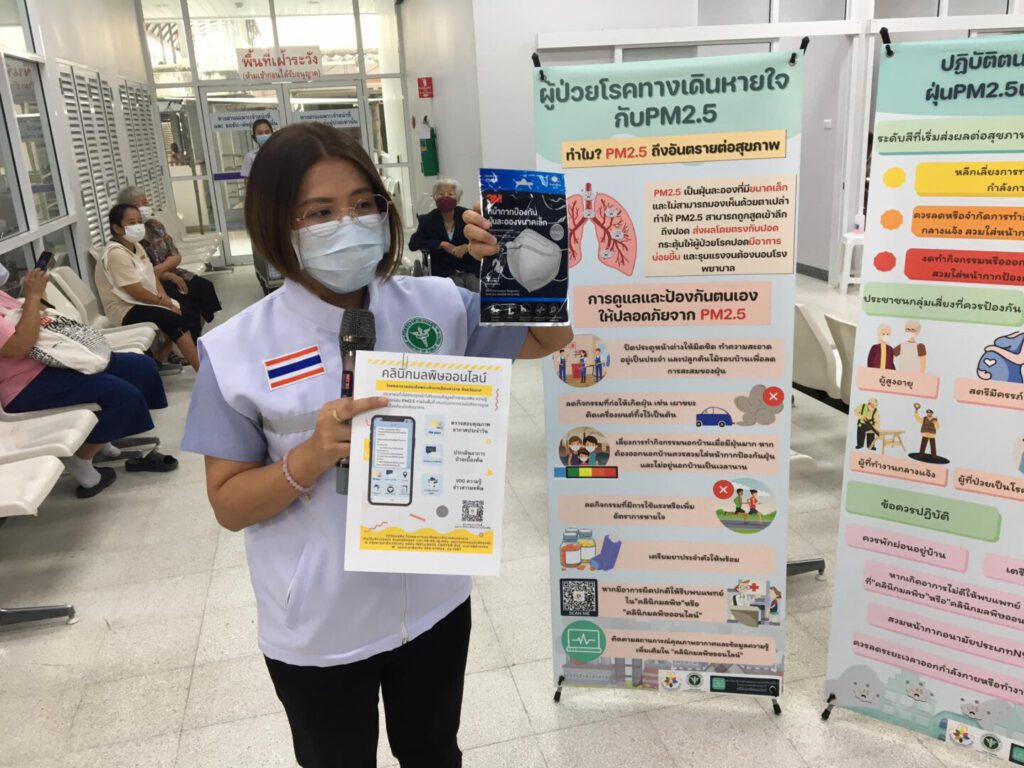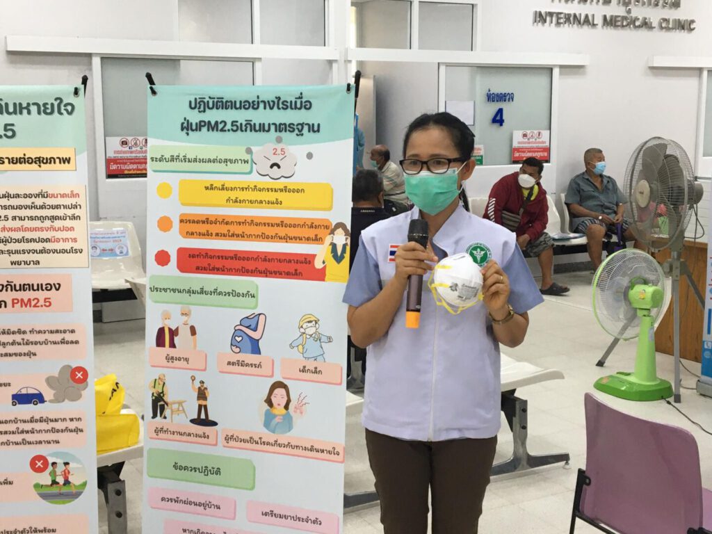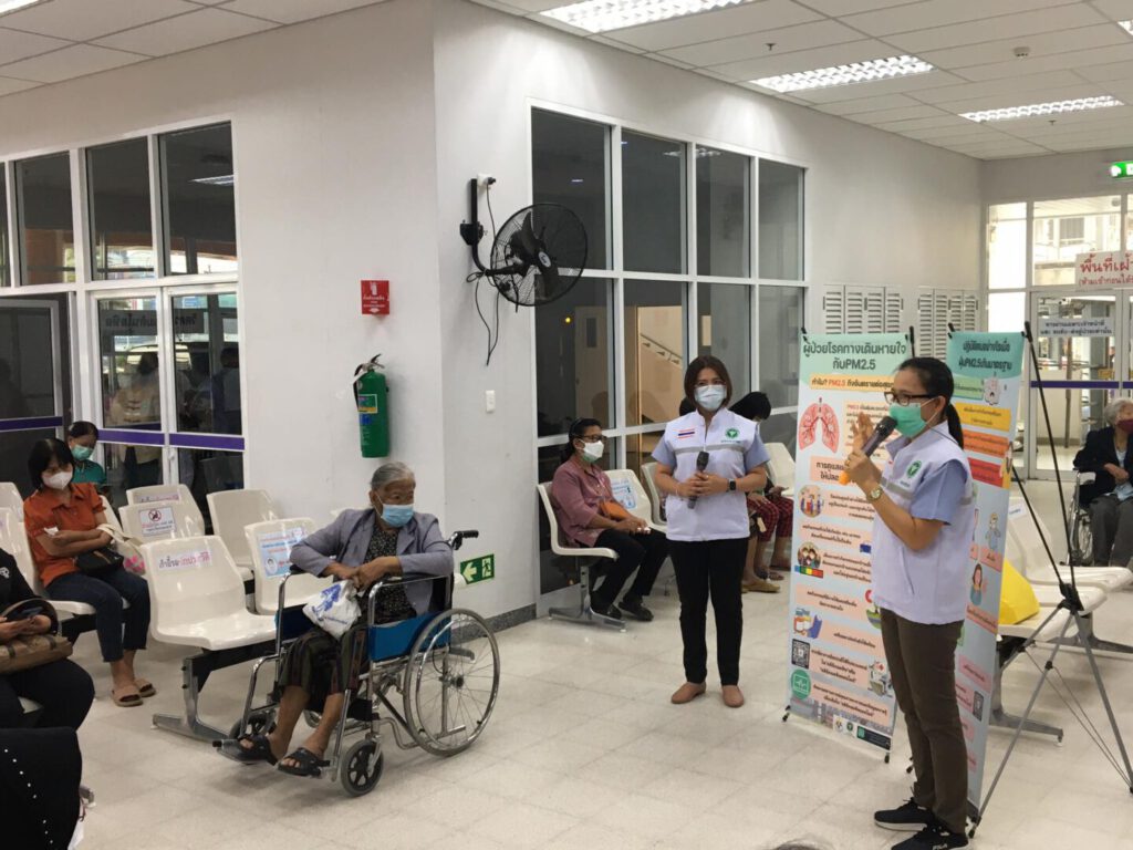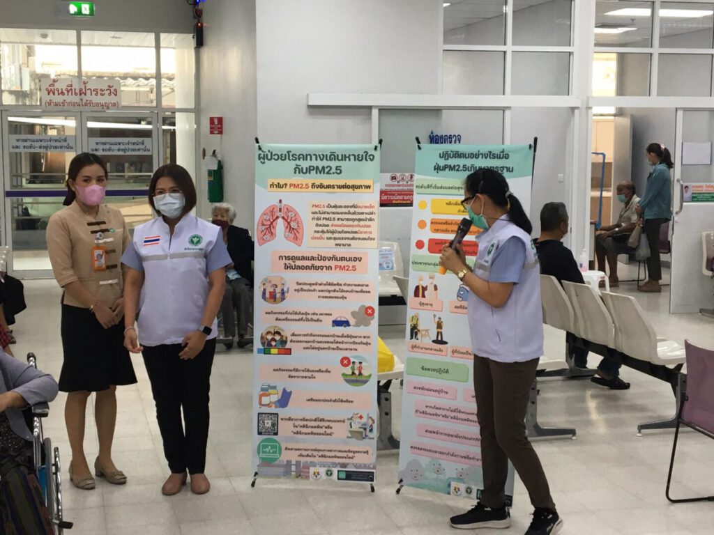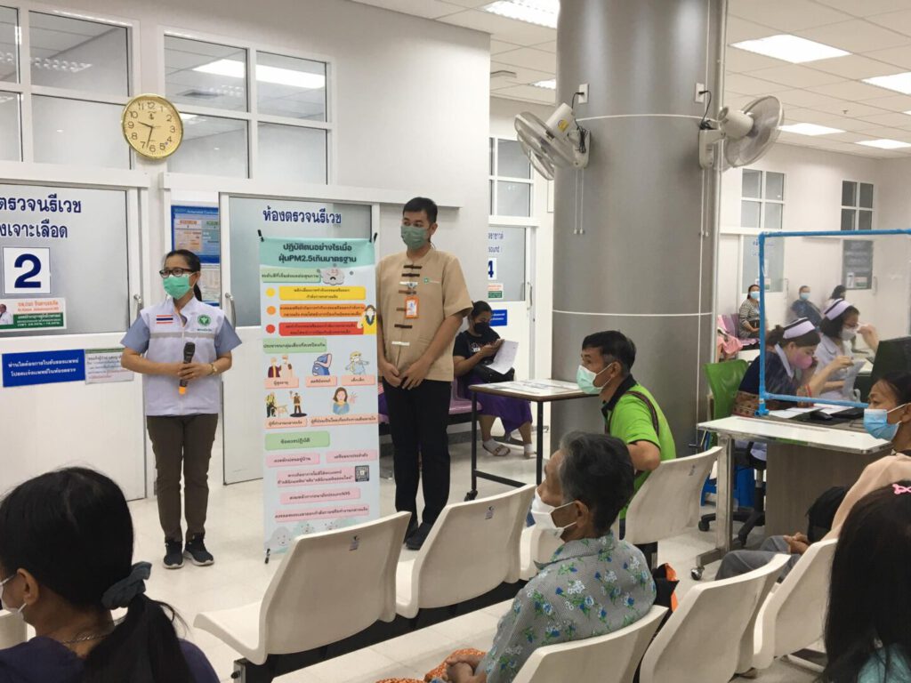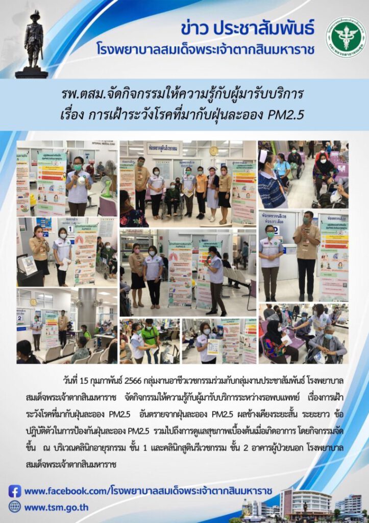วันที่ 15 กุมภาพันธ์ 2566 กลุ่มงานอาชีวเวชกรรมร่วมกับกลุ่มงานประชาสัมพันธ์ โรงพยาบาลสมเด็จพระเจ้าตากสินมหาราช จัดกิจกรรมให้ความรู้กับผู้มารับบริการระหว่างรอพบแพทย์ เรื่องการเฝ้าระวังโรคที่มากับฝุ่นละออง PM2.5 อันตรายจากฝุ่นละออง PM2.5 ผลข้างเคียงระยะสั้น ระยะยาว ข้อปฎิบัติตัวในการป้องกันฝุ่นละออง PM2.5 รวมไปถึงการดูแลสุขภาพเบื้องต้นเมื่อเกิดอาการ โดยกิจกรรมจัดขึ้น ณ บริเวณคลินิกอายุรกรรม ชั้น 1 และคลินิกสูตินรีเวชกรรม ชั้น 2 อาคารผู้ป่วยนอก โรงพยาบาลสมเด็จพระเจ้าตากสินมหาราช