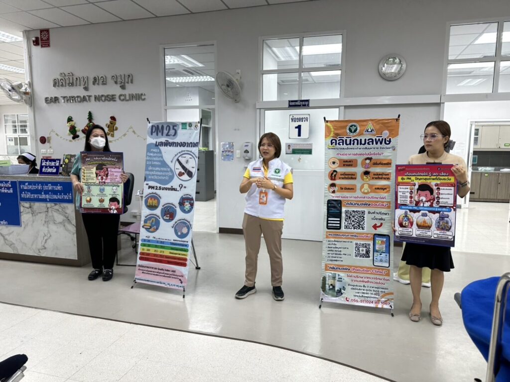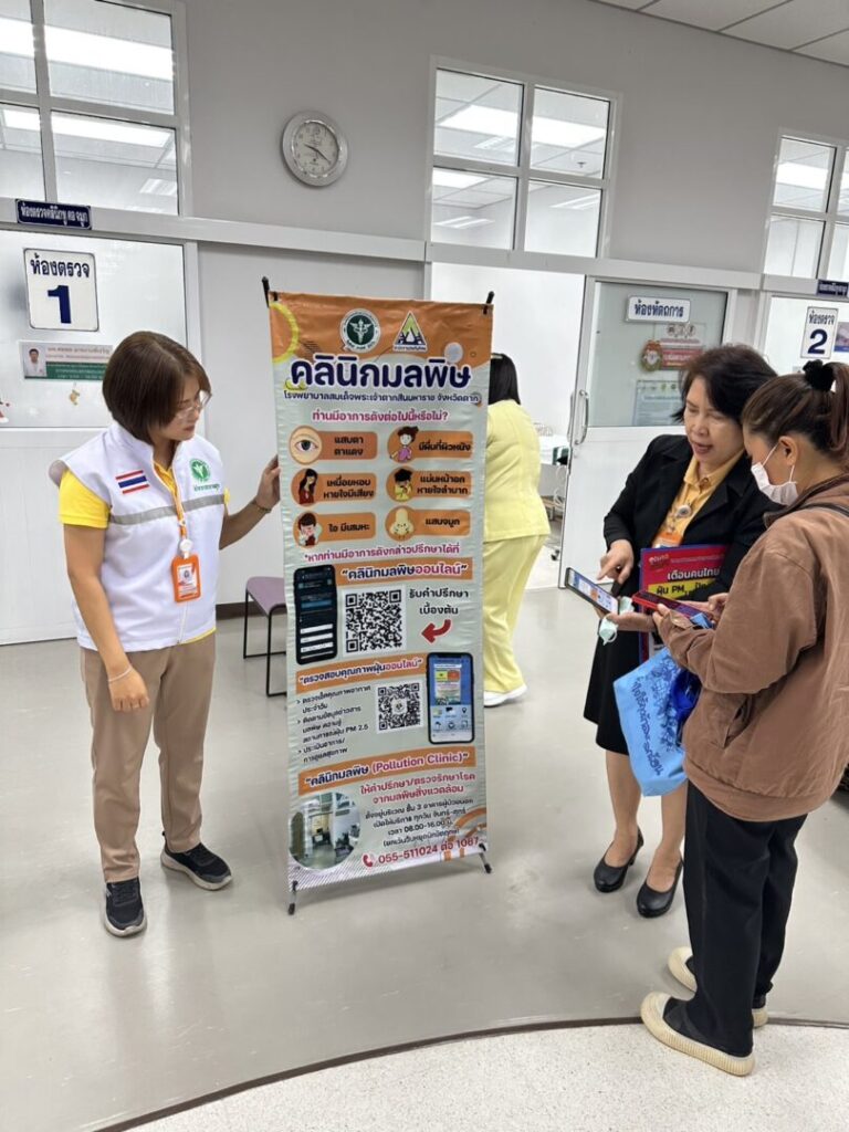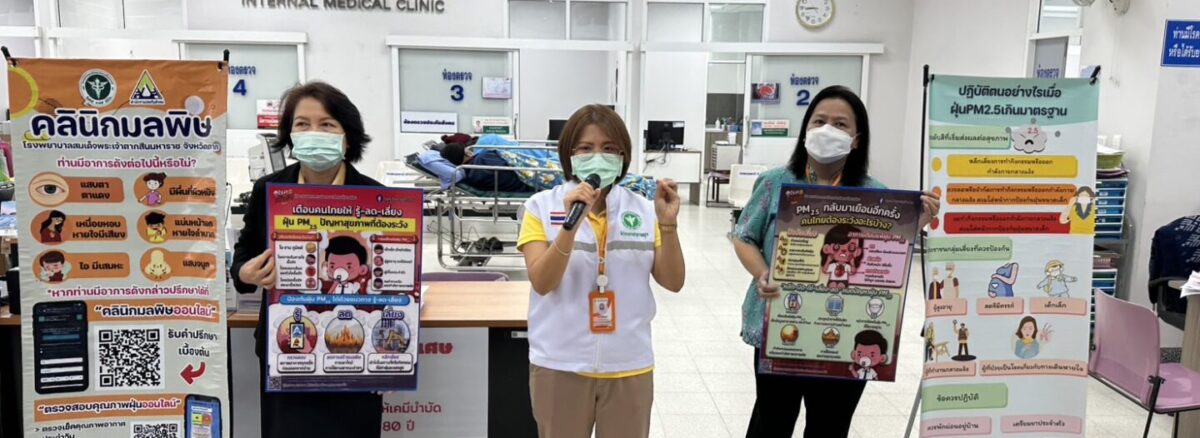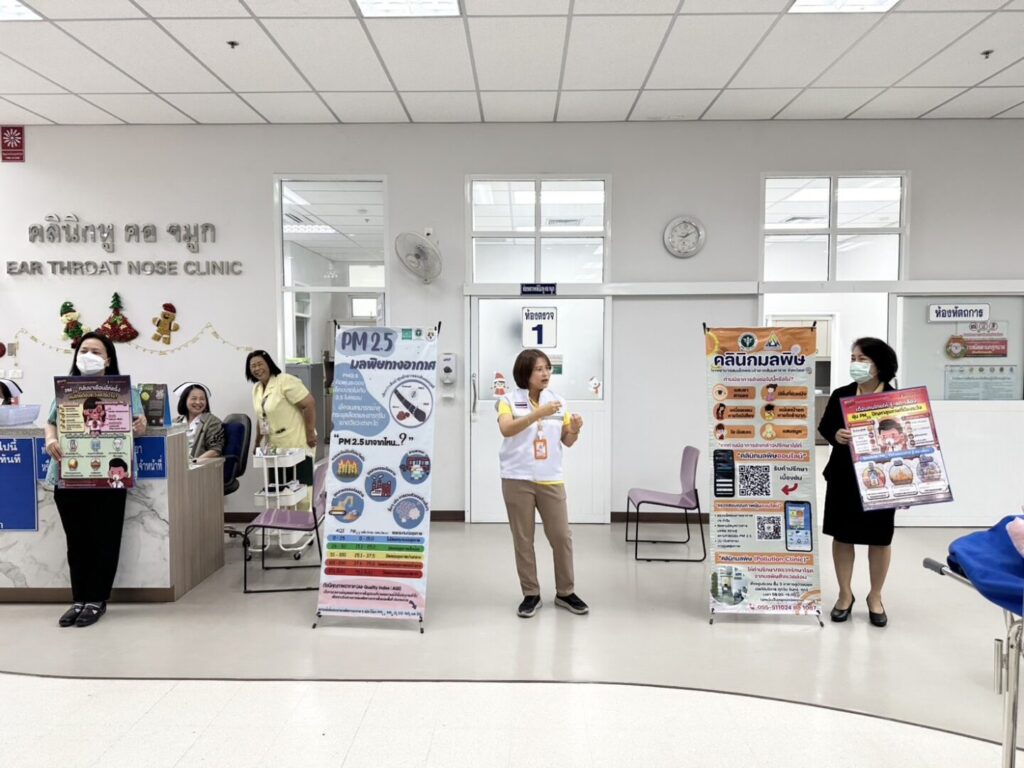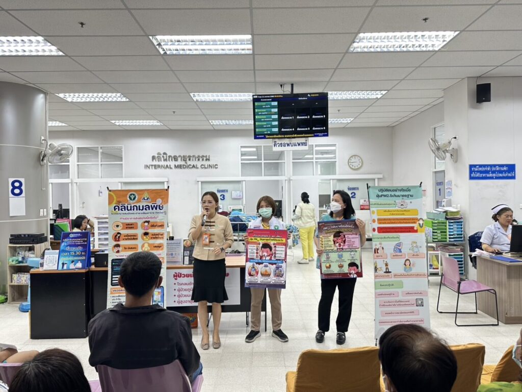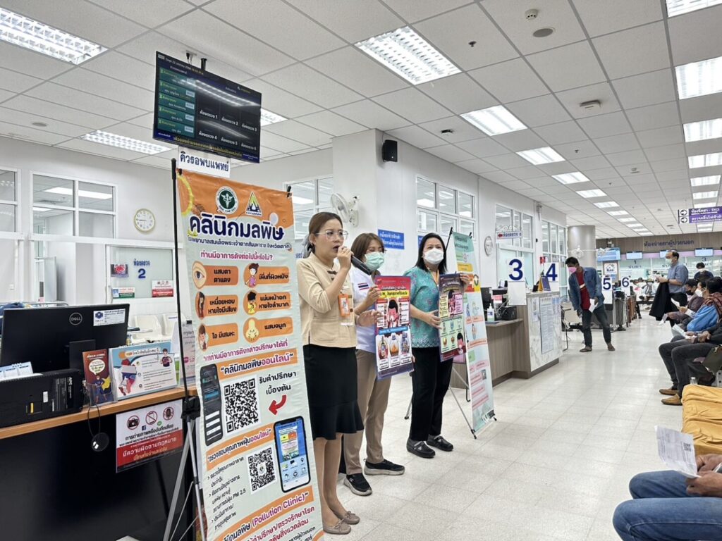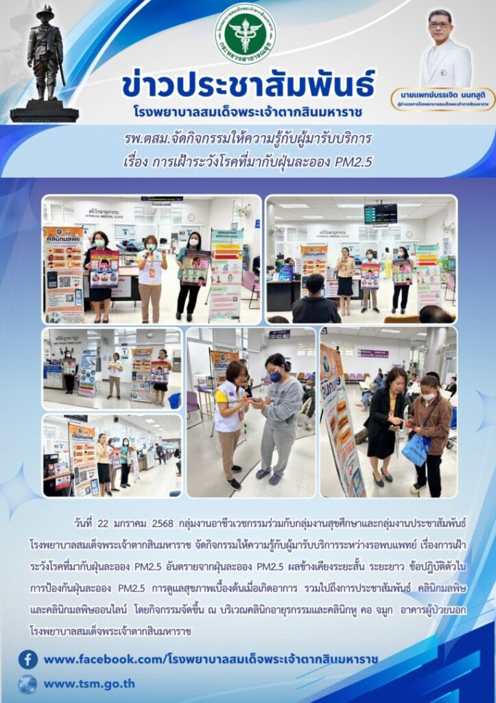 วันที่ 22 มกราคม 2568 กลุ่มงานอาชีวเวชกรรมร่วมกับกลุ่มงานสุขศึกษาและกลุ่มงานประชาสัมพันธ์ โรงพยาบาลสมเด็จพระเจ้าตากสินมหาราช จัดกิจกรรมให้ความรู้กับผู้มารับบริการระหว่างรอพบแพทย์ เรื่องการเฝ้าระวังโรคที่มากับฝุ่นละออง PM2.5 อันตรายจากฝุ่นละออง PM2.5 ผลข้างเคียงระยะสั้น ระยะยาว ข้อปฎิบัติตัวในการป้องกันฝุ่นละออง PM2.5 การดูแลสุขภาพเบื้องต้นเมื่อเกิดอาการ รวมไปถึงการประชาสัมพันธ์ คลินิกมลพิษ และคลินิกมลพิษออนไลน์ โดยกิจกรรมจัดขึ้น ณ บริเวณคลินิกอายุรกรรมและคลินิกหู คอ จมูก อาคารผู้ป่วยนอก โรงพยาบาลสมเด็จพระเจ้าตากสินมหาราช