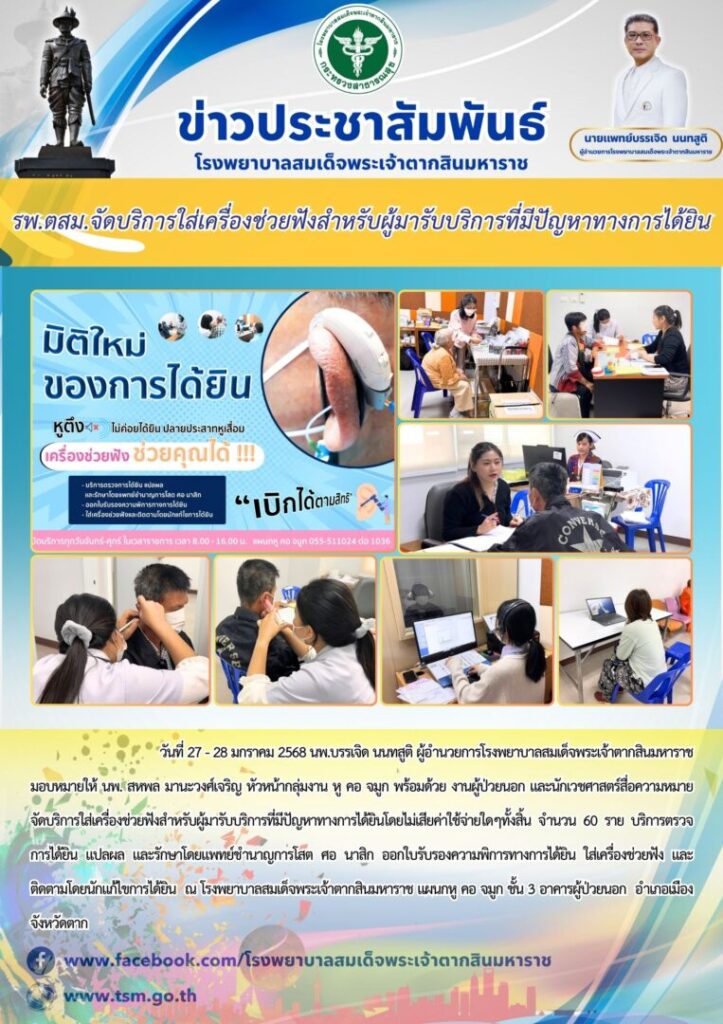 วันที่ 27 – 28 มกราคม 2568 นพ.บรรเจิด นนทสูติ ผู้อำนวยการโรงพยาบาลสมเด็จพระเจ้าตากสินมหาราช มอบหมายให้ นพ. สหพล มานะวงศ์เจริญ หัวหน้ากลุ่มงาน หู คอ จมูก พร้อมด้วย งานผู้ป่วยนอก และนักเวชศาสตร์สื่อความหมาย จัดบริการใส่เครื่องช่วยฟังสำหรับผู้มารับบริการที่มีปัญหาทางการได้ยินโดยไม่เสียค่าใช้จ่ายใดๆทั้งสิ้น จำนวน 60 ราย บริการตรวจการได้ยิน แปลผล และรักษาโดยแพทย์ชำนาญการโสต ศอ นาสิก ออกใบรับรองความพิการทางการได้ยิน ใส่เครื่องช่วยฟัง และติดตามโดยนักแก้ไขการได้ยิน ณ โรงพยาบาลสมเด็จพระเจ้าตากสินมหาราช แผนกหู คอ จมูก ชั้น 3 อาคารผู้ป่วยนอก อำเภอเมือง จังหวัดตาก