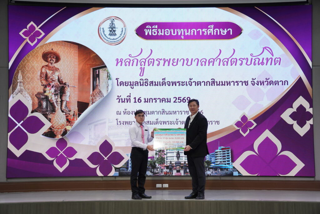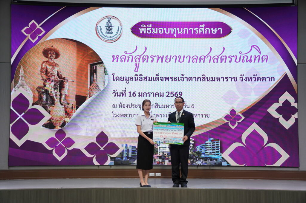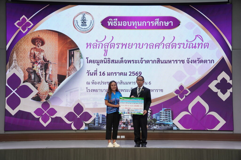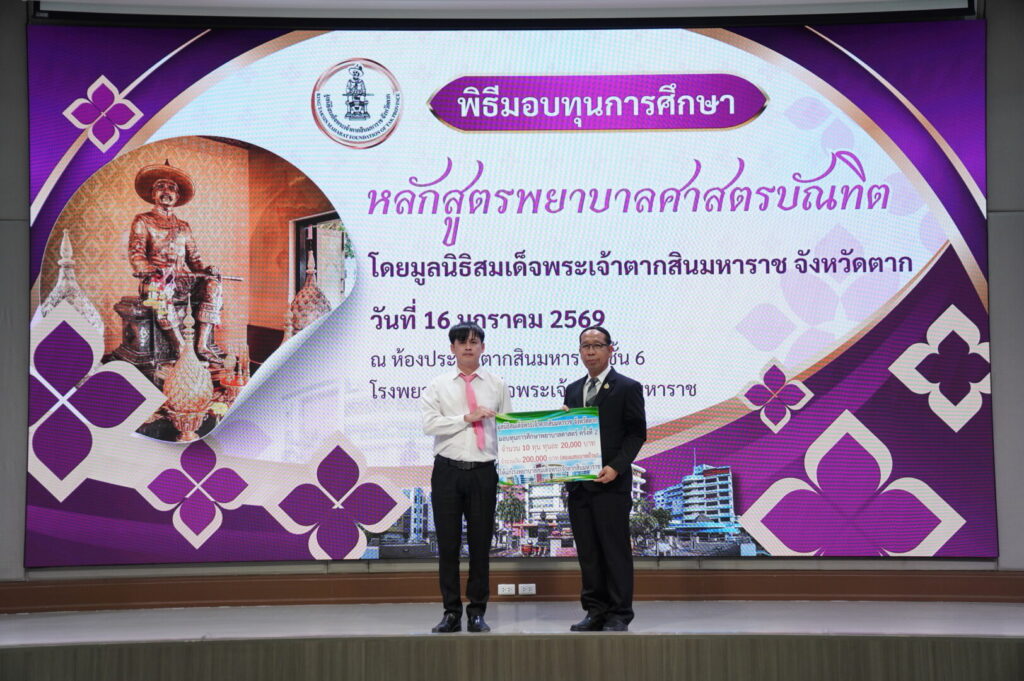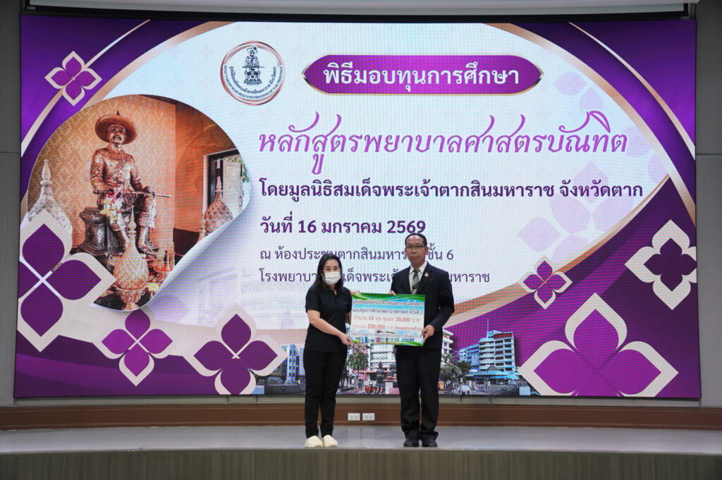 วันที่ 16 มกราคม 2569 นพ.มงคล ลือชูวงศ์ ผู้อำนวยการโรงพยาบาลสมเด็จพระเจ้าตากสินมหาราช ได้จัดพิธีมอบทุนการศึกษาหลักสูตรพยาบาลศาสตรบัณฑิต ได้รับเกียรติจาก นายชูศักดิ์ รู้ยิ่ง ผู้ว่าราชการจังหวัดตาก เป็นประธานมูลนิธิสมเด็จพระเจ้าตากสินมหาราช จังหวัดตาก เป็นประธานในพิธีมอบทุนการศึกษา ณ ห้องประชุมตากสินมหาราช ชั้น 6 อาคารผู้ป่วยนอก โรงพยาบาลสมเด็จพระเจ้าตากสินมหาราช