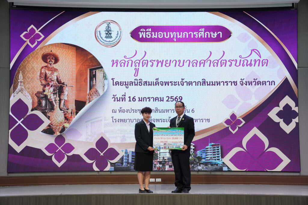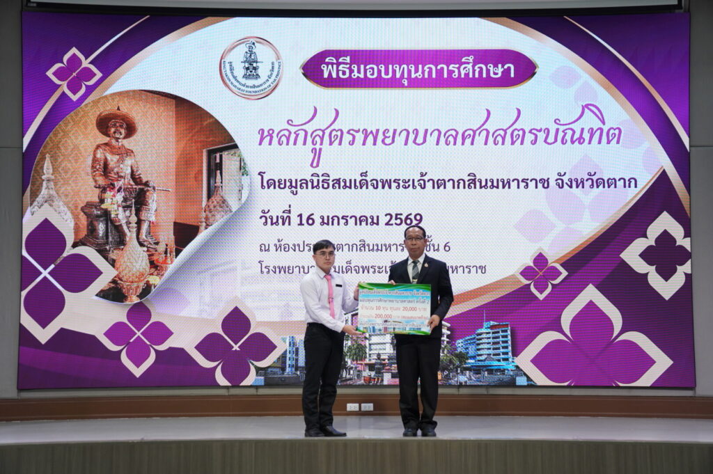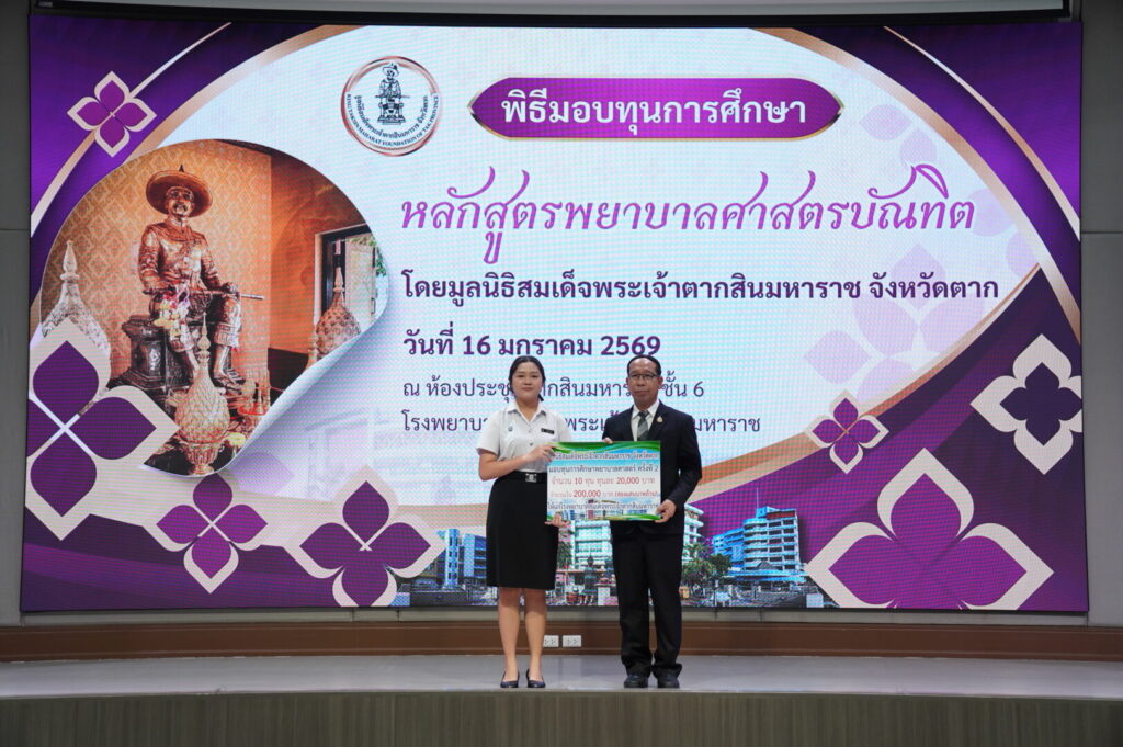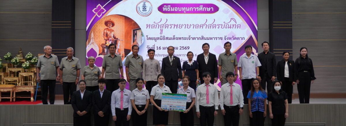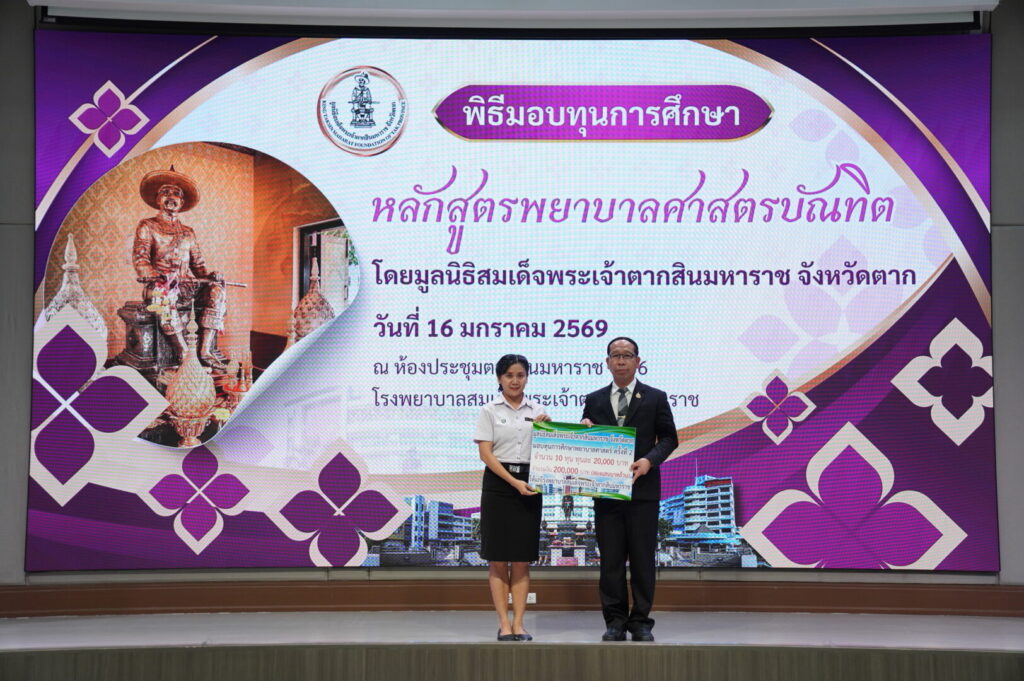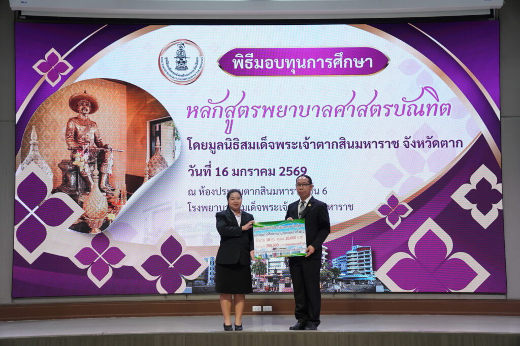 วันที่ 16 มกราคม 2569 นพ.มงคล ลือชูวงศ์ ผู้อำนวยการโรงพยาบาลสมเด็จพระเจ้าตากสินมหาราช ได้จัดพิธีมอบทุนการศึกษาหลักสูตรพยาบาลศาสตรบัณฑิต ได้รับเกียรติจาก นายชูศักดิ์ รู้ยิ่ง ผู้ว่าราชการจังหวัดตาก เป็นประธานมูลนิธิสมเด็จพระเจ้าตากสินมหาราช จังหวัดตาก เป็นประธานในพิธีมอบทุนการศึกษา ณ ห้องประชุมตากสินมหาราช ชั้น 6 อาคารผู้ป่วยนอก โรงพยาบาลสมเด็จพระเจ้าตากสินมหาราช
