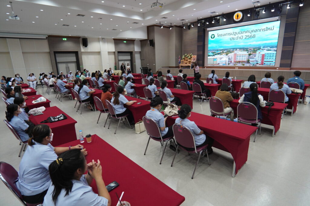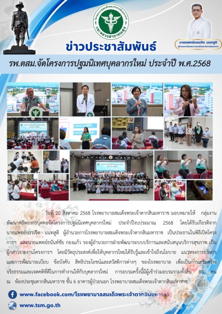 วันที่ 20 สิงหาคม 2568 โรงพยาบาลสมเด็จพระเจ้าตากสินมหาราช มอบหมายให้ กลุ่มงานพัฒนาทรัพยากรบุคคลจัดโครงการปฐมนิเทศบุคลากรใหม่ ประจำปีงบประมาณ 2568 โดยได้รับเกียรติจาก นายแพทย์บรรเจิด นนทสูติ ผู้อำนวยการโรงพยาบาลสมเด็จพระเจ้าตากสินมหาราช เป็นประธานในพิธีเปิดโครงการฯ และนายแพทย์ธนันท์ชัย กองแก้ว รองผู้อำนวยการฝ่ายพัฒนาระบบบริการและสนับสนุนบริการสุขภาพ เป็นผู้กล่าวรายงานโครงการฯ โดยมีวัตถุประสงค์เพื่อให้บุคลากรใหม่ได้รับรู้และเข้าใจถึงนโยบาย แนวทางการบริหาร และการพัฒนาระเบียบ ข้อบังคับ สิทธิประโยชน์และสวัสดิการต่างๆ ของโรงพยาบาล เพื่อเป็นการเสริมสร้างจริยธรรมและเจตคติที่ดีในการทำงานให้กับบุคลากรใหม่ การอบรมครั้งนี้มีผู้เข้าร่วมอบรมรวมทั้งสิ้น 80 คน ณ ห้องประชุมตากสินมหาราช ชั้น 6 อาคารผู้ป่วยนอก โรงพยาบาลสมเด็จพระเจ้าตากสินมหาราช