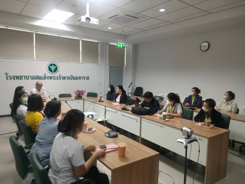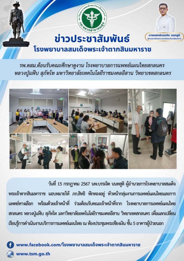 วันที่ 15 กรกฎาคม 2567 นพ.บรรเจิด นนทสูติ ผู้อำนวยการโรงพยาบาลสมเด็จพระเจ้าตากสินมหาราช มอบหมายให้ ภก.สิทธิ ฟักทองอยู่ หัวหน้ากลุ่มงานการแพทย์แผนไทยและการแพทย์ทางเลือก พร้อมด้วยเจ้าหน้าที่ ร่วมต้อนรับคณะเจ้าหน้าที่จาก โรงพยาบาลการแพทย์แผนไทยสกลนคร หลวงปู่แฟ็บ สุภัทโท มหาวิทยาลัยเทคโนโลยีราชมงคลอีสาน วิทยาเขตสกลนคร เพื่อแลกเปลี่ยนเรียนรู้การดำเนินงานบริการการแพทย์แผนไทย ณ ห้องประชุมพระเชียงเงิน ชั้น 5 อาคารผู้ป่วยนอก