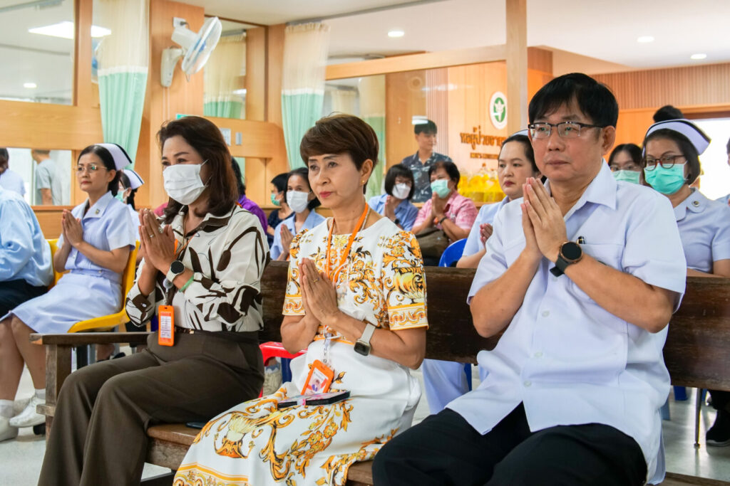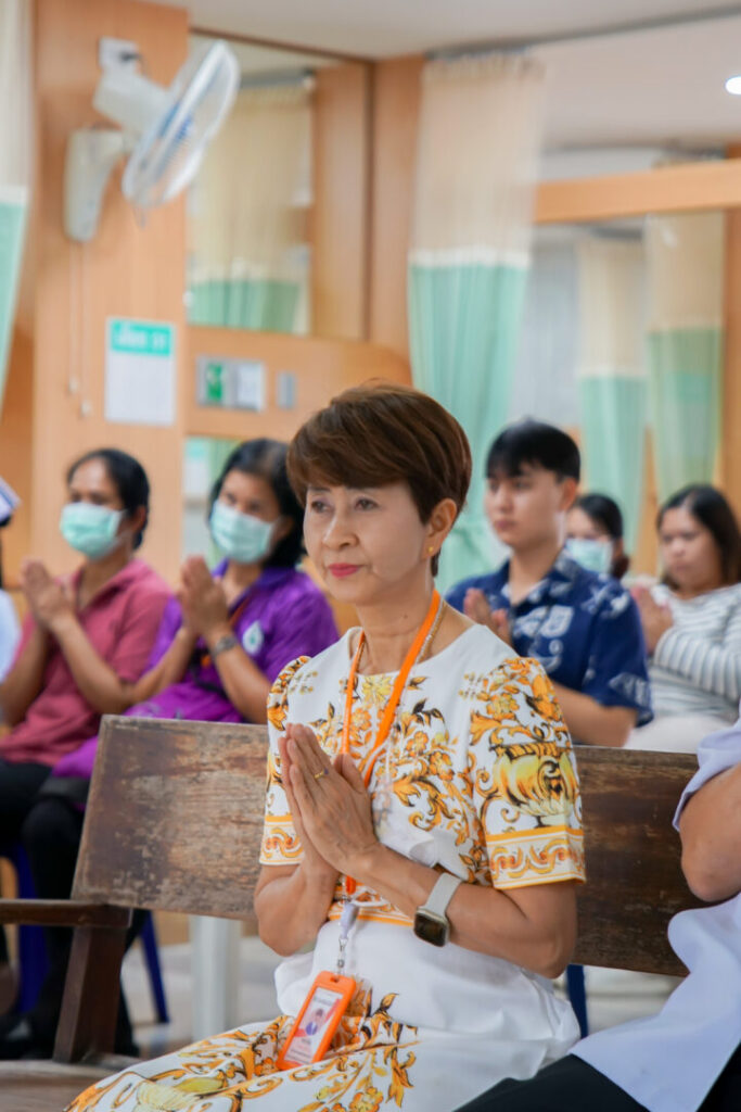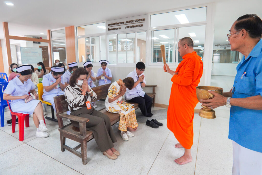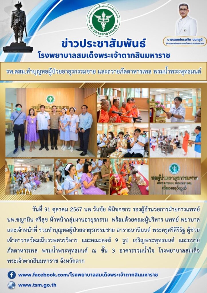 วันที่ 31 ตุลาคม 2567 นพ.วันชัย พินิชกชกร รองผู้อำนวยการฝ่ายการแพทย์ นพ.ชญานิน ศรีสุข หัวหน้ากลุ่มงานอายุรกรรม พร้อมด้วยคณะผู้บริหาร แพทย์ พยาบาล และเจ้าหน้าที่ ร่วมทำบุญหอผู้ป่วยอายุรกรรมชาย อาราธนานิมนต์ พระครูศรีคีรีรัฐ ผู้ช่วยเจ้าอาวาสวัดมณีบรรพตวรวิหาร และคณะสงฆ์ 9 รูป เจริญพระพุทธมนต์ และถวายภัตตาหารเพล พรมน้ำพระพุทธมนต์ ณ ชั้น 3 อาคารรวมน้ำใจ โรงพยาบาลสมเด็จพระเจ้าตากสินมหาราช จังหวัดตาก