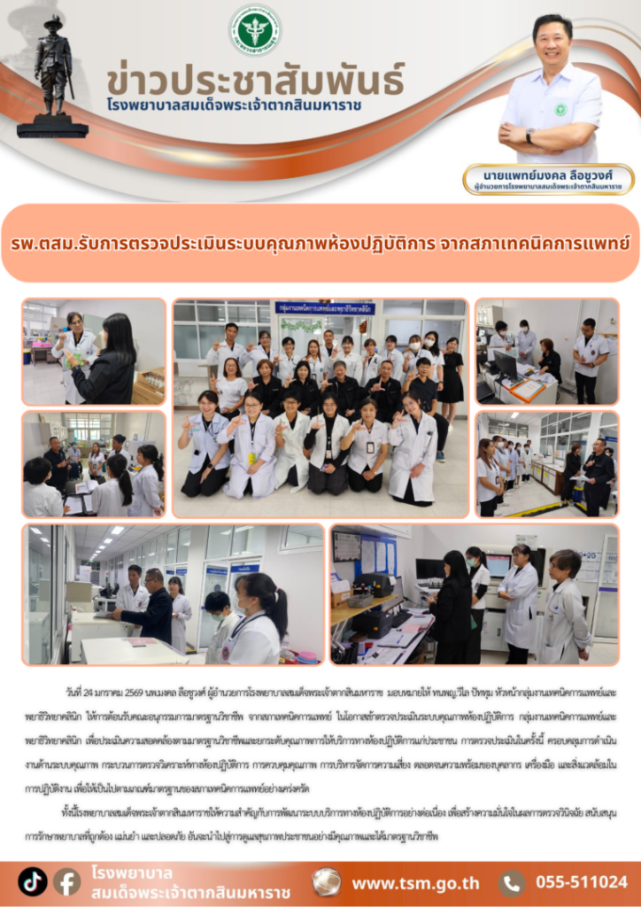 วันที่ 24 มกราคม 2569 นพ.มงคล ลือชูวงศ์ ผู้อำนวยการโรงพยาบาลสมเด็จพระเจ้าตากสินมหาราช มอบหมายให้ ทนพญ.วิไล ปัททุม หัวหน้ากลุ่มงานเทคนิคการแพทย์และพยาธิวิทยาคลินิก ให้การต้อนรับคณะอนุกรรมการมาตรฐานวิชาชีพ จากสภาเทคนิคการแพทย์ ในโอกาสเข้าตรวจประเมินระบบคุณภาพห้องปฏิบัติการ กลุ่มงานเทคนิคการแพทย์และพยาธิวิทยาคลินิก เพื่อประเมินความสอดคล้องตามมาตรฐานวิชาชีพและยกระดับคุณภาพการให้บริการทางห้องปฏิบัติการแก่ประชาชน การตรวจประเมินในครั้งนี้ ครอบคลุมการดำเนินงานด้านระบบคุณภาพ กระบวนการตรวจวิเคราะห์ทางห้องปฏิบัติการ การควบคุมคุณภาพ การบริหารจัดการความเสี่ยง ตลอดจนความพร้อมของบุคลากร เครื่องมือ และสิ่งแวดล้อมในการปฏิบัติงาน เพื่อให้เป็นไปตามเกณฑ์มาตรฐานของสภาเทคนิคการแพทย์อย่างเคร่งครัด