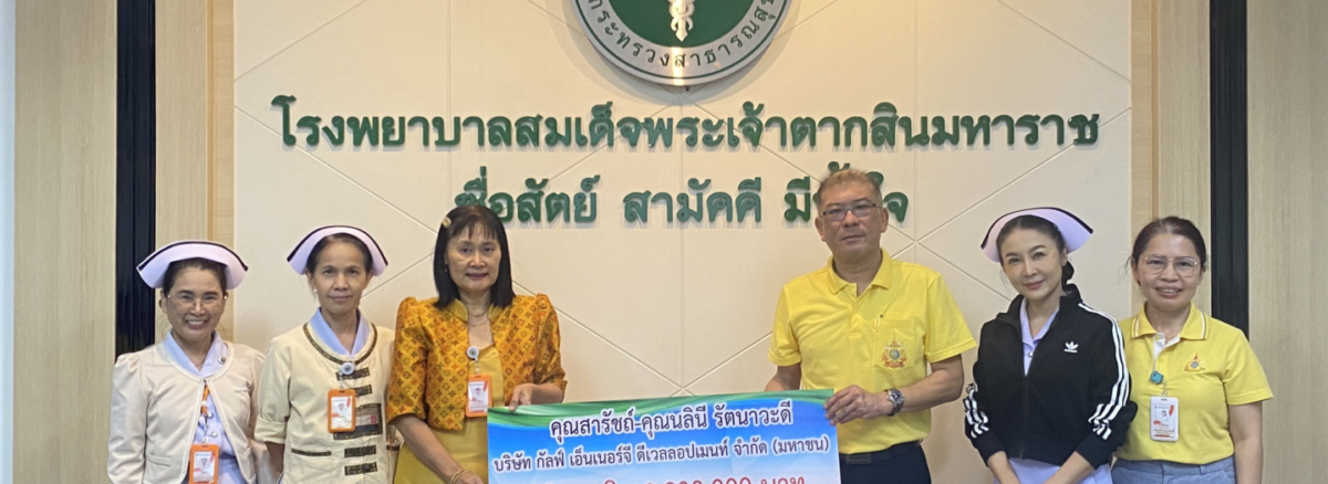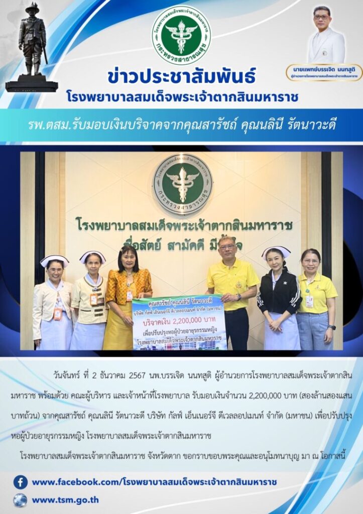 วันจันทร์ ที่ 2 ธันวาคม 2567 นพ.บรรเจิด นนทสูติ ผู้อำนวยการโรงพยาบาลสมเด็จพระเจ้าตากสินมหาราช พร้อมด้วย คณะผู้บริหาร และเจ้าหน้าที่โรงพยาบาล รับมอบเงินจำนวน 2,200,000 บาท (สองล้านสองแสนบาทถ้วน) จากคุณสารัชถ์ คุณนลินี รัตนาวะดี บริษัท กัลฟ์ เอ็นเนอร์จี ดีเวลลอปเมนท์ จำกัด (มหาชน) เพื่อปรับปรุงหอผู้ป่วยอายุรกรรมหญิง โรงพยาบาลสมเด็จพระเจ้าตากสินมหาราช