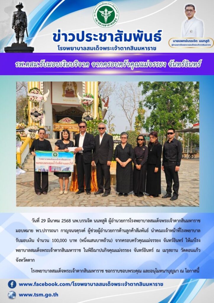 วันที่ 29 มีนาคม 2568 นพ.บรรเจิด นนทสูติ ผู้อำนวยการโรงพยาบาลสมเด็จพระเจ้าตากสินมหาราช พร้อมด้วย พว.ปรารถนา กาญจนจตุรงค์ ผู้ช่วยผู้อำนวยการด้านลูกค้าสัมพันธ์ นำคณะเจ้าหน้าที่โรงพยาบาล รับมอบเงิน จำนวน 100,000 บาท (หนึ่งแสนบาทถ้วน) จากคุณวิสิฐ ตันติสุนทร และครอบครัว เพื่อจัดซื้ออุปกรณ์ทางการแพทย์ โรงพยาบาลสมเด็จพระเจ้าตากสินมหาราช