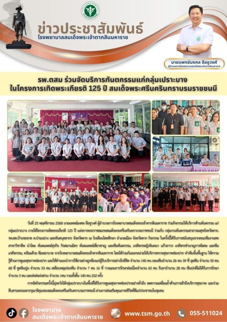 วันที่ 25 พฤศจิกายน 2568 นายแพทย์มงคล ลือชูวงศ์ ผู้อำนวยการโรงพยาบาลสมเด็จพระเจ้าตากสินมหาราช ร่วมกิจกรรมให้บริการด้านทันตกรรม แก่กลุ่มเปราะบาง ภายใต้โครงการเทิดพระเกียรติ 125 ปี แห่งการพระราชสมภพสมเด็จพระศรีนครินทราบรมราชชนนี ร่วมกับ กลุ่มงานทันตกรรมสาธารณสุขจังหวัดตาก, รพ.สต.บ้านชะลาด ต.ป่ามะม่วง และทันตบุคลากร จังหวัดตาก ณ โรงเรียนโสตศึกษา อำเภอเมือง จังหวัดตาก กิจกรรม ในครั้งนี้ได้รับการสนับสนุนจากคณะทีมงานสหสาขาวิชาชีพ นำโดย ทันตแพทย์สุรกิจ กิจสมานมิตร ทันตแพทย์เชี่ยวชาญ และทีมทันตกรรม, เภสัชกรหญิงจินตนา แก้วถาวร เภสัชกรชํานาญการพิเศษ และทีมเภสัชกรรม, พร้อมด้วย ทีมพยาบาล จากโรงพยาบาลสมเด็จพระเจ้าตากสินมหาราช โดยได้ร่วมกันออกหน่วยให้บริการตรวจสุขภาพช่องปาก ทำฟันขั้นพื้นฐาน ให้ความรู้ด้านการดูแลสุขภาพช่องปาก และให้คำแนะนำการใช้ยาอย่างถูกต้องแก่ผู้รับบริการอย่างใกล้ชิด จำนวน 140 คน ถอนฟันจำนวน 26 คน 39 ซี่ อุดฟัน จำนวน 50 คน 68 ซี่ ขูดหินปูน จำนวน 53 คน เคลือบหลุมร่องฟัน จำนวน 7 คน 16 ซี่ วางแผนการรักษาต่อเนื่องจำนวน 63 คน รับยาจำนวน 28 คน ฟันปกติไม่ได้รับการรักษา จำนวน 5 คน และส่งต่อเร่งด่วน จำนวน 1คน รวมทั้งสิ้น 140 คน 232 ครั้ง