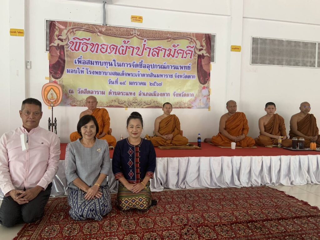 วันที่ 14 มกราคม 2567 นพ.บรรเจิด นนทสูติ ผู้อำนวยการโรงพยาบาลสมเด็จพระเจ้าตากสินมหาราช นำคณะผู้บริหาร พร้อมด้วยเจ้าหน้าที่โรงพยาบาล หน่วยงานสาธารณสุขจังหวัดตาก และประชาชนทั่วไป ร่วมทำบุญทอดผ้าป่าสามัคคี เพื่อจัดซื้อครุภัณฑ์ทางการแพทย์ ณ วัดสีตลาราม (วัดน้ำหัก) อ.เมือง จ.ตาก มีผู้มีจิตศรัทธาร่วมทำบุญทอดผ้าป่าสามัคคี 1,013,777.27 บาท (หนึ่งล้านหนึ่งหมื่นสามพันเจ็ดร้อยเจ็ดสิบเจ็ดบาทยี่สิบเจ็ดสตางค์) โดยมี พระธรรมวชิรเมธาจารย์ เจ้าคณะภาค 4-5 (ธ) ,กรรมการมหาเถรสมาคม วัดโสมนัสราชวรวิหาร กรุงเทพมหหานคร ประธานฝ่ายบรรพชิต พระสุเมธีธรรมภาณ เจ้าคณะจังหวัดตาก (ธ) เจ้าอาวาสวัดสีตลาราม จังหวัดตาก คณะที่ปรึกษาและอุปถัมภ์ฝ่ายบรรพชิต นายแพทย์วิทยา พลสีลา สาธารณสุขนิเทศก์ เขตสุขภาพที่ 2 ประธานฝ่ายฆราวาส ดร.เกศราภรณ์ พลสีลา อุปนายก สมาคมแม่บ้านสาธารณสุข ประธานที่ปรึกษาฝ่ายฆราวาส และนายแพทย์ละลิ่ว จิตต์การุญ ประธานมูลนิธิเพื่อโรงพยาบาลสมเด็จพระเจ้าตากสินมหาราช เป็นประธานที่ปรึกษา พร้อมด้วยนายแพทย์บรรเจิด นนทสูติ ผู้อำนวยการโรงพยาบาลสมเด็จพระเจ้าตากสินมหาราช เป็นประธานดำเนินการ