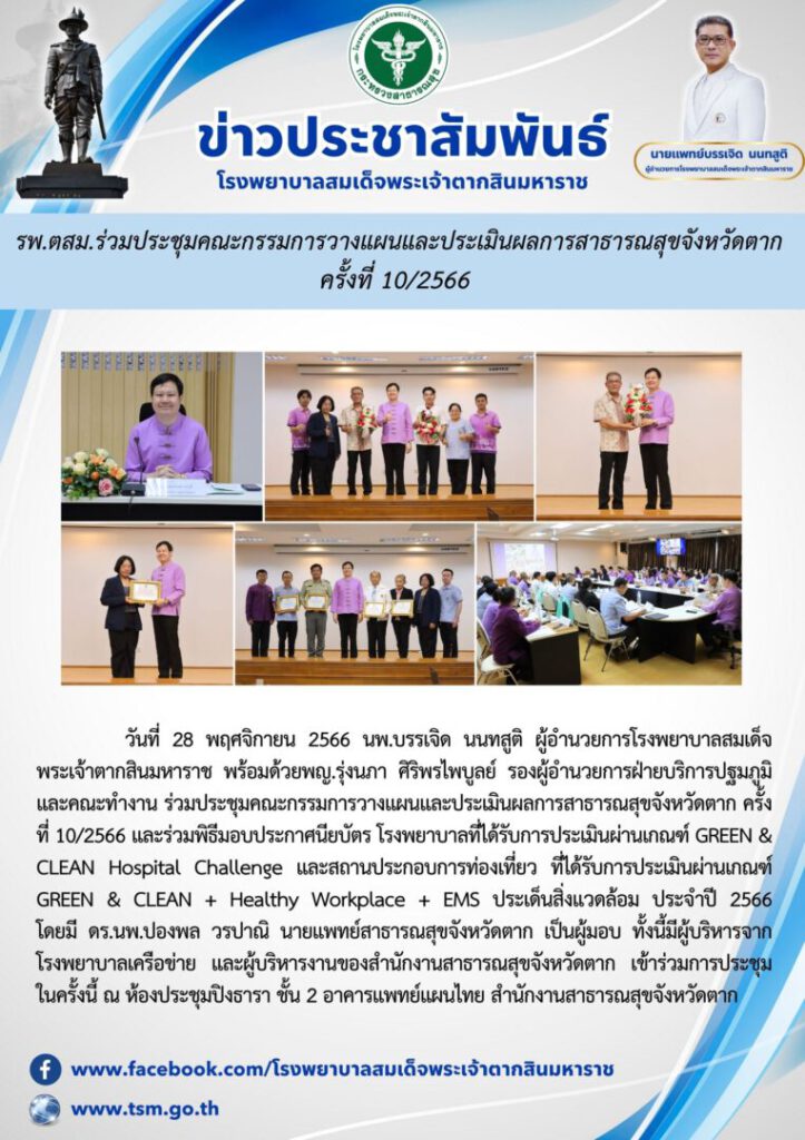 วันที่ 28 พฤศจิกายน 2566 นพ.บรรเจิด นนทสูติ ผู้อำนวยการโรงพยาบาลสมเด็จพระเจ้าตากสินมหาราช พร้อมด้วยพญ.รุ่งนภา ศิริพรไพบูลย์ รองผู้อำนวยการฝ่ายบริการปฐมภูมิ และคณะทำงาน ร่วมประชุมคณะกรรมการวางแผนและประเมินผลการสาธารณสุขจังหวัดตาก ครั้งที่ 10/2566 และร่วมพิธีมอบประกาศนียบัตร โรงพยาบาลที่ได้รับการประเมินผ่านเกณฑ์ GREEN & CLEAN Hospital Challenge และสถานประกอบการท่องเที่ยว ที่ได้รับการประเมินผ่านเกณฑ์ GREEN & CLEAN + Healthy Workplace + EMS ประเด็นสิ่งแวดล้อม ประจำปี 2566 โดยมี ดร.นพ.ปองพล วรปาณิ นายแพทย์สาธารณสุขจังหวัดตาก เป็นผู้มอบ ทั้งนี้มีผู้บริหารจาก โรงพยาบาลเครือข่าย และผู้บริหารงานของสำนักงานสาธารณสุขจังหวัดตาก เข้าร่วมการประชุมในครั้งนี้ ณ ห้องประชุมปิงธารา ชั้น 2 อาคารแพทย์แผนไทย สำนักงานสาธารณสุขจังหวัดตาก