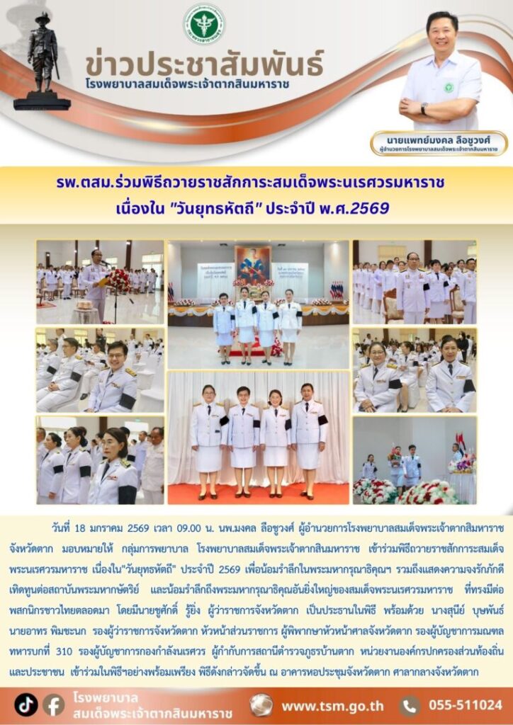 วันที่ 18 มกราคม 2569 เวลา 09.00 น. นพ.มงคล ลือชูวงศ์ ผู้อำนวยการโรงพยาบาลสมเด็จพระเจ้าตากสิมหาราช จังหวัดตาก มอบหมายให้ กลุ่มการพยาบาล โรงพยาบาลสมเด็จพระเจ้าตากสินมหาราช เข้าร่วมพิธีถวายราชสักการะสมเด็จ พระนเรศวรมหาราช เนื่องใน”วันยุทธหัตถี” ประจำปี 2569 เพื่อน้อมรำลึกในพระมหากรุณาธิคุณฯ รวมถึงแสดงความจงรักภักดี เทิดทูนต่อสถาบันพระมหากษัตริย์ และน้อมรำลึกถึงพระมหากรุณาธิคุณอันยิ่งใหญ่ของสมเด็จพระนเรศวรมหาราช ที่ทรงมีต่อพสกนิกรชาวไทยตลอดมา โดยมีนายชูศักดิ์ รู้ยิ่ง ผู้ว่าราชการจังหวัดตาก เป็นประธานในพิธี พร้อมด้วย นางสุนีย์ บุษพันธ์ นายอาทร พิมชะนก รองผู้ว่าราชการจังหวัดตาก หัวหน้าส่วนราชการ ผู้พิพากษาหัวหน้าศาลจังหวัดตาก รองผู้บัญชาการมณฑลทหารบกที่ 310 รองผู้บัญชาการกองกำลังนเรศวร ผู้กำกับการสถานีตำรวจภูธรบ้านตาก หน่วยงานองค์กรปกครองส่วนท้องถิ่น และประชาชน เข้าร่วมในพิธีฯอย่างพร้อมเพรียง พิธีดังกล่าวจัดขึ้น ณ อาคารหอประชุมจังหวัดตาก ศาลากลางจังหวัดตาก