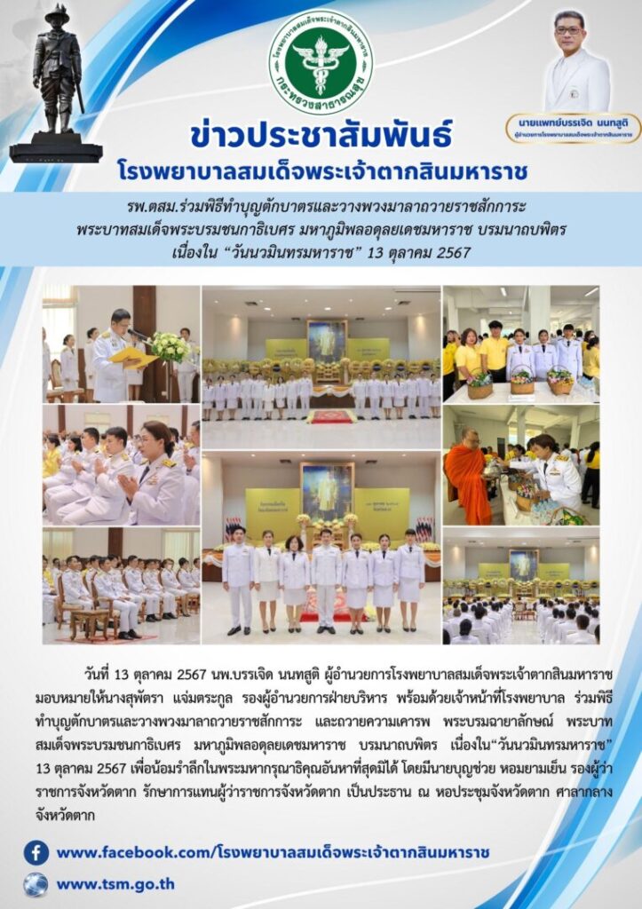 วันที่ 13 ตุลาคม 2567 นพ.บรรเจิด นนทสูติ ผู้อำนวยการโรงพยาบาลสมเด็จพระเจ้าตากสินมหาราช มอบหมายให้นางสุพัตรา แจ่มตระกูล รองผู้อำนวยการฝ่ายบริหาร พร้อมด้วยเจ้าหน้าที่โรงพยาบาล ร่วมพิธีทำบุญตักบาตรและวางพวงมาลาถวายราชสักการะ และถวายความเคารพ พระบรมฉายาลักษณ์ พระบาทสมเด็จพระบรมชนกาธิเบศร มหาภูมิพลอดุลยเดชมหาราช บรมนาถบพิตร เนื่องใน“วันนวมินทรมหาราช” 13 ตุลาคม 2567 เพื่อน้อมรำลึกในพระมหากรุณาธิคุณอันหาที่สุดมิได้ โดยมีนายบุญช่วย หอมยามเย็น รองผู้ว่าราชการจังหวัดตาก รักษาการแทนผู้ว่าราชการจังหวัดตาก เป็นประธาน ณ หอประชุมจังหวัดตาก ศาลากลางจังหวัดตาก