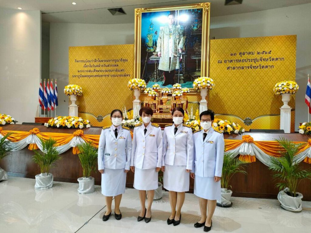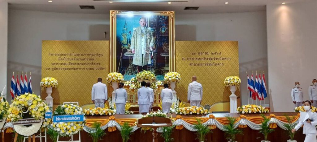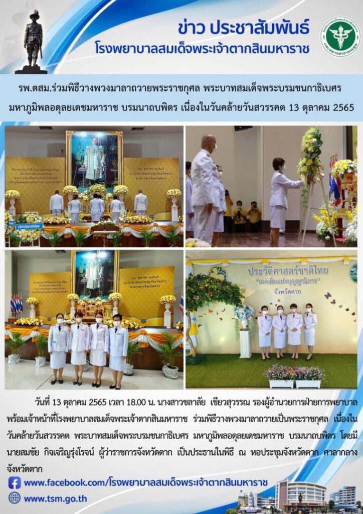 วันที่ 13 ตุลาคม 2565 เวลา 18.00 น. นางสาวชลาลัย เขียวสุวรรณ รองผู้อำนวยการฝ่ายการพยาบาล พร้อมเจ้าหน้าที่โรงพยาบาลสมเด็จพระเจ้าตากสินมหาราช ร่วมพิธีวางพวงมาลาถวายเป็นพระราชกุศล เนื่องใน วันคล้ายวันสวรรคต พระบาทสมเด็จพระบรมชนกาธิเบศร มหาภูมิพลอดุลยเดชมหาราช บรมนาถบพิตร โดยมี นายสมชัย กิจเจริญรุ่งโรจน์ ผู้ว่าราชการจังหวัดตาก เป็นประธานในพิธี ณ หอประชุมจังหวัดตาก ศาลากลางจังหวัดตาก