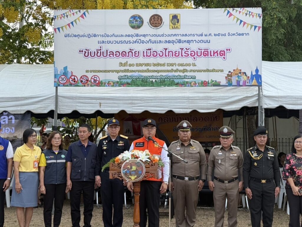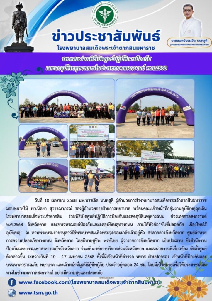วันที่ 10 เมษายน 2568 นพ.บรรเจิด นนทสูติ ผู้อำนวยการโรงพยาบาลสมเด็จพระเจ้าตากสินมหาราช มอบหมายให้ พว.นิตยา สุวรรณาภรณ์ รองผู้อำนวยการฝ่ายการพยาบาล พร้อมคณะเจ้าหน้าที่กลุ่มงานอุบัติเหตุฉุกเฉิน โรงพยาบาลสมเด็จพระเจ้าตากสินมหาราช ร่วมพิธีเปิดศูนย์ปฏิบัติการป้องกันและลดอุบัติเหตุทางถนน ช่วงเทศกาลสงกรานต์ พ.ศ.2568 จังหวัดตาก และขบวนรณรงค์ป้องกันและลดอุบัติเหตุทางถนน ภายใต้หัวข้อ “ขับขี่ปลอดภัย เมืองไทย ไร้อุบัติเหตุ” ณ ลานพระบรมราชานุสาวรีย์พระบาทสมเด็จพระจุลจอมเกล้าเจ้าอยู่หัว ศาลากลางจังหวัดตาก ศูนย์อำนวยการความปลอดภัยทางถนน จังหวัดตาก โดยมีนายชูชีพ พงษ์ไชย ผู้ว่าราชการจังหวัดตาก เป็นประธาน ซึ่งสำนักงานป้องกันและบรรมเทาสาธารณภัยจังหวัดตาก ร่วมกับองค์การบริหารส่วนจังหวัดตาก และหน่วยงานที่เกี่ยวข้อง จัดตั้งศูนย์ดังกล่าวขึ้น ระหว่างวันที่ 10 – 17 เมษายน 2568 ทั้งนี้มีเจ้าหน้าที่ตำรวจ ทหาร ฝ่ายปกครอง เจ้าหน้าที่ป้องกันและบรรเทาสาธารณภัย พยาบาล และเจ้าหน้าที่มูลนิธิกู้ชีพกู้ภัย ประจำอยู่ตลอด 24 ชม. โดยมีเป้าหมายเพื่อให้ประชาชนเดินทางในช่วงเทศกาลสงกรานต์ อย่างมีความสุขและปลอดภัย
