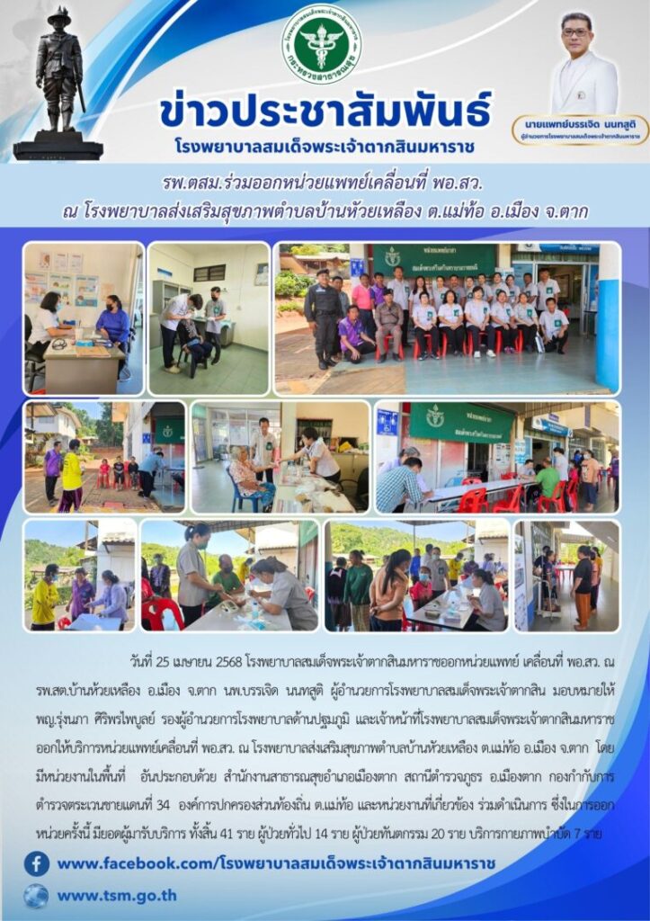 วันที่ 25 เมษายน 2568 โรงพยาบาลสมเด็จพระเจ้าตากสินมหาราชออกหน่วยแพทย์ เคลื่อนที่ พอ.สว. ณ รพ.สต.บ้านห้วยเหลือง อ.เมือง จ.ตาก นพ.บรรเจิด นนทสูติ ผู้อำนวยการโรงพยาบาลสมเด็จพระเจ้าตากสิน มอบหมายให้ พญ.รุ่งนภา ศิริพรไพบูลย์ รองผู้อำนวยการโรงพยาบาลด้านปฐมภูมิ และเจ้าหน้าที่โรงพยาบาลสมเด็จพระเจ้าตากสินมหาราช ออกให้บริการหน่วยแพทย์เคลื่อนที่ พอ.สว. ณ โรงพยาบาลส่งเสริมสุขภาพตำบลบ้านหัวยเหลือง ต.แม่ท้อ อ.เมือง จ.ตาก โดยมีหน่วยงานในพื้นที่ อันประกอบด้วย สำนักงานสาธารณสุขอำเภอเมืองตาก สถานีตำรวจภูธร อ.เมืองตาก กองกำกับการตำรวจตระเวนชายแดนที่ 34 องค์การปกครองส่วนท้องถิ่น ต.แม่ท้อ และหน่วยงานที่เกี่ยวข้อง ร่วมดำเนินการ ซึ่งในการออกหน่วยครั้งนี้ มียอดผู้มารับบริการ ทั้งสิ้น 41 ราย ผู้ป่วยทั่วไป 14 ราย ผู้ป่วยทันตกรรม 20 ราย บริการกายภาพบำบัด 7 ราย