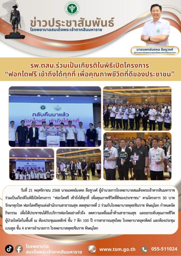 วันที่ 21 พฤศจิกายน 2568 นายแพทย์มงคล ลือชูวงศ์ ผู้อำนวยการโรงพยาบาลสมเด็จพระเจ้าตากสินมหาราช ร่วมเป็นเกียรติในพิธีเปิดโครงการ “ฟอกไตฟรี เข้าถึงได้ทุกที่ เพื่อคุณภาพชีวิตที่ดีของประชาชน” ตามโครงการ 30 บาท รักษาทุกโรค ฟอกไตฟรีทุกแห่งสำนักงานสาธารณสุข เขตสุขภาพที่ 2 ร่วมกับโรงพยาบาลพุทธชินราช พิษณุโลก กำหนดจัดกิจกรรม เพื่อให้ประชาชนได้รับบริการฟอกไตอย่างทั่วถึง ลดความเหลื่อมล้ำด้านสาธารณสุข และยกระดับคุณภาพชีวิต ผู้ป่วยโรคไตในพื้นที่ ณ ห้องประชุมมเหสักข์ ชั้น 7 ตึก 100 ปี การสาธารณสุขไทย โรงพยาบาลอุตรดิตถ์ และห้องประชุมเบนทูล ชั้น 4 อาคารอำนวยการ โรงพยาบาลพุทธชินราช พิษณุโลก