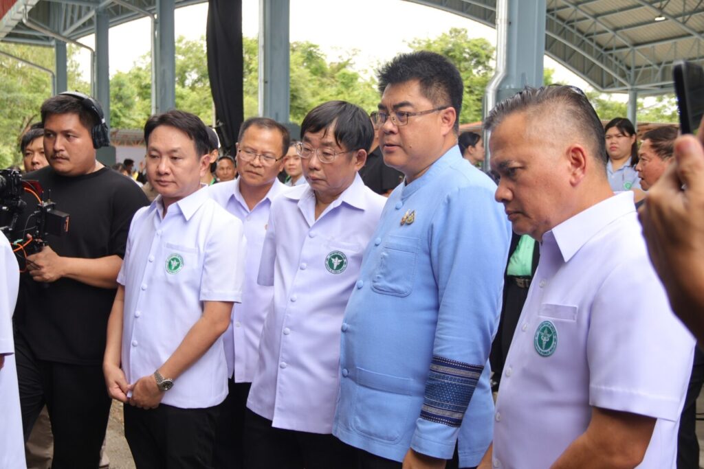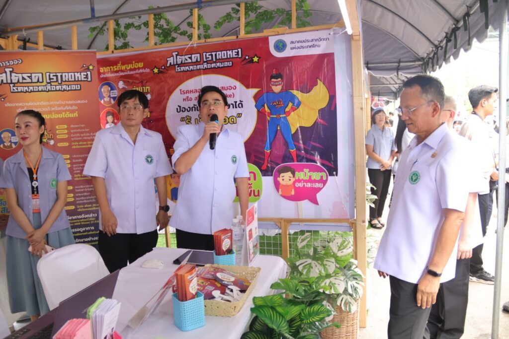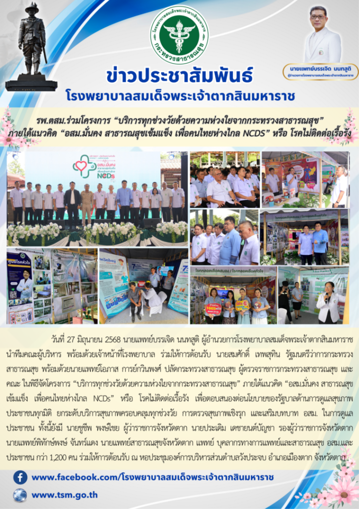 วันที่ 27 มิถุนายน 2568 นายแพทย์บรรเจิด นนทสูติ ผู้อำนวยการโรงพยาบาลสมเด็จพระเจ้าตากสินมหาราช นำทีมคณะผู้บริหาร พร้อมด้วยเจ้าหน้าที่โรงพยาบาล ร่วมให้การต้อนรับ นายสมศักดิ์ เทพสุทิน รัฐมนตรีว่าการกระทรวงสาธารณสุข พร้อมด้วยนายแพทย์โอภาส การย์กวินพงศ์ ปลัดกระทรวงสาธารณสุข ผู้ตรวจราชการกระทรวงสาธารณสุข และคณะ ในพิธีจัดโครงการ “บริการทุกช่วงวัยด้วยความห่วงใยจากกระทรวงสาธารณสุข” ภายใต้แนวคิด “อสม.มั่นคง สาธารณสุขเข้มแข็ง เพื่อคนไทยห่างไกล NCDs” หรือ โรคไม่ติดต่อเรื้อรัง เพื่อตอบสนองต่อนโยบายของรัฐบาลด้านการดูแลสุขภาพประชาชนทุกมิติ ยกระดับบริการสุขภาพครอบคลุมทุกช่วงวัย การตรวจสุขภาพเชิงรุก และเสริมบทบาท อสม. ในการดูแลประชาชน ทั้งนี้ยังมี นายชูชีพ พงษ์ไชย ผู้ว่าราชการจังหวัดตาก นายประเดิม เดชายนต์บัญชา รองผู้ว่าราชการจังหวัดตาก นายแพทย์พิทักษ์พงษ์ จันทร์แดง นายแพทย์สาธารณสุขจังหวัดตาก แพทย์ บุคลากรทางการแพทย์และสาธารณสุข อสม.และประชาชน กว่า 1,200 คน ร่วมให้การต้อนรับ ณ หอประชุมองค์การบริหารส่วนตำบลวังประจบ อำเภอเมืองตาก จังหวัดตาก