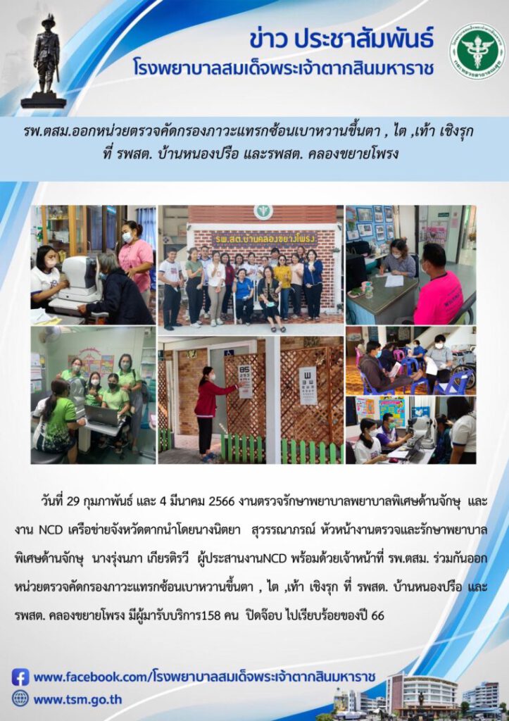 วันที่ 29 กุมภาพันธ์ และ 4 มีนาคม 2566 งานตรวจรักษาพยาบาลพยาบาลพิเศษด้านจักษุ และงาน NCD เครือข่ายจังหวัดตากนำโดยนางนิตยา สุวรรณาภรณ์ หัวหน้างานตรวจและรักษาพยาบาลพิเศษด้านจักษุ นางรุ่งนภา เกียรติรวี ผู้ประสานงานNCD พร้อมด้วยเจ้าหน้าที่ รพ.ตสม. ร่วมกันออกหน่วยตรวจคัดกรองภาวะแทรกซ้อนเบาหวานขึ้นตา , ไต ,เท้า เชิงรุก ที่ รพสต. บ้านหนองปรือ และรพสต. คลองขยายโพรง มีผู้มารับบริการ158 คน ปิดจ๊อบ ไปเรียบร้อยของปี 66