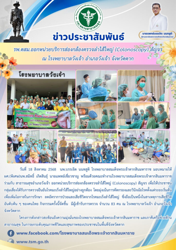 วันที่ 18 สิงหาคม 2568 นพ.บรรเจิด นนทสูติ โรงพยาบาลสมเด็จพระเจ้าตากสินมหาราช มอบหมายให้ ผศ.(พิเศษ)นพ.สมิทธิ์ เกิดสินธุ์ นายแพทย์เชี่ยวชาญ พร้อมด้วยคณะทำงานโรงพยาบาลสมเด็จพระเจ้าตากสินมหาราช ร่วมกับ สาธารณสุขอำเภอวังเจ้า ออกหน่วยบริการส่องกล้องตรวจลำไส้ใหญ่ (Colonoscopy) สัญจร เพื่อให้ประชาชนกลุ่มเสี่ยงได้รับการตรวจยืนยันโรคมะเร็งลำไส้ใหญ่อย่างถูกต้อง โดยมุ่งเน้นการคัดกรองและวินิจฉัยโรคตั้งแต่ระยะเริ่มต้น เพื่อเพิ่มโอกาสในการรักษา ลดอัตราการป่วยและเสียชีวิตจากโรคมะเร็งลำไส้ใหญ่ ซึ่งถือเป็นหนึ่งในสาเหตุการเสียชีวิตอันดับต้น ๆ ของคนไทย กิจกรรมครั้งนี้จัดขึ้น มีผู้เข้ารับการตรวจ จำนวน 83 คน ณ โรงพยาบาลวังเจ้า อำเภอวังเจ้า จังหวัดตาก
