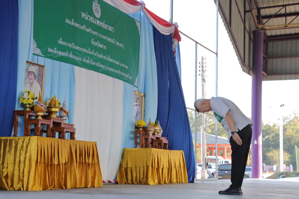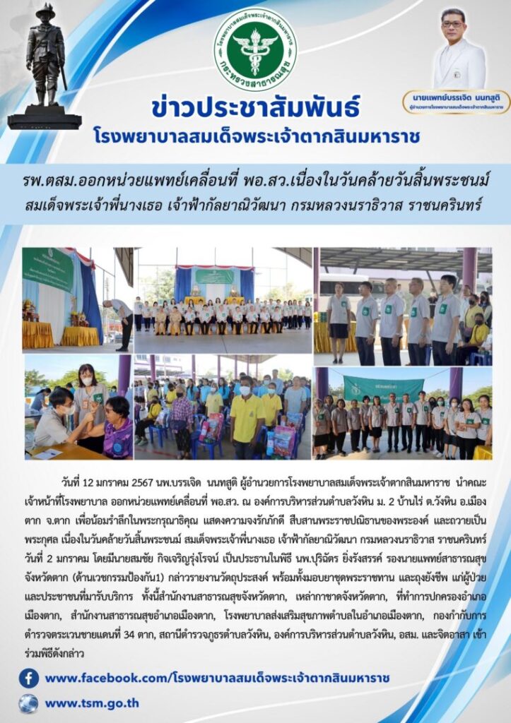 วันที่ 12 มกราคม 2567 นพ.บรรเจิด นนทสูติ ผู้อำนวยการโรงพยาบาลสมเด็จพระเจ้าตากสินมหาราช นำคณะเจ้าหน้าที่โรงพยาบาล ออกหน่วยแพทย์เคลื่อนที่ พอ.สว. ณ องค์การบริหารส่วนตำบลวังหิน ม. 2 บ้านไร่ ต.วังหิน อ.เมืองตาก จ.ตาก เพื่อน้อมรำลึกในพระกรุณาธิคุณ แสดงความจงรักภักดี สืบสานพระราชปณิธานของพระองค์ และถวายเป็นพระกุศล เนื่องในวันคล้ายวันสิ้นพระชนม์ สมเด็จพระเจ้าพี่นางเธอ เจ้าฟ้ากัลยาณิวัฒนา กรมหลวงนราธิวาส ราชนครินทร์ วันที่ 2 มกราคม โดยมีนายสมชัย กิจเจริญรุ่งโรจน์ เป็นประธานในพิธี นพ.ปุริฉัตร ยิ่งรังสรรค์ รองนายแพทย์สาธารณสุขจังหวัดตาก (ด้านเวชกรรมป้องกัน1) กล่าวรายงานวัตถุประสงค์ พร้อมทั้งมอบยาชุดพระราชทาน และถุงยังชีพ แก่ผู้ป่วยและประชาชนที่มารับบริการ ทั้งนี้สำนักงานสาธารณสุขจังหวัดตาก, เหล่ากาชาดจังหวัดตาก, ที่ทำการปกครองอำเภอเมืองตาก, สำนักงานสาธารณสุขอำเภอเมืองตาก, โรงพยาบาลส่งเสริมสุขภาพตำบลในอำเภอเมืองตาก, กองกำกับการตำรวจตระเวนชายแดนที่ 34 ตาก, สถานีตำรวจภูธรตำบลวังหิน, องค์การบริหารส่วนตำบลวังหิน, อสม. และจิตอาสา เข้าร่วมพิธีดังกล่าว
