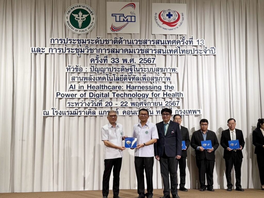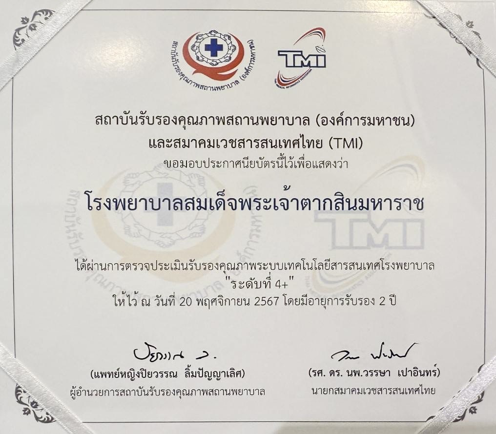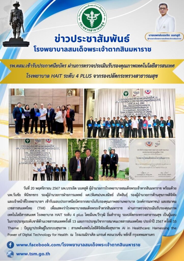 วันที่ 20 พฤศจิกายน 2567 นพ.บรรเจิด นนทสูติ ผู้อำนวยการโรงพยาบาลสมเด็จพระเจ้าตากสินมหาราช พร้อมด้วย นพ.วันชัย พินิชกชกร รองผู้อำนวยการฝ่ายการแพทย์ ผศ.(พิเศษ)นพ.สมิทธ์ เกิดสินธุ์ รองผู้อำนวยการด้านสุขภาพดิจิทัล และเจ้าหน้าที่โรงพยาบาลฯ เข้ารับมอบประกาศนียบัตรจากสถาบันรับรองคุณภาพสถานพยาบาล (องค์การมหาชน) และสมาคมเวชสารสนเทศไทย (TMI) เพื่อแสดงว่าโรงพยาบาลสมเด็จพระเจ้าตากสินมหาราช ผ่านการตรวจประเมินรับรองคุณภาพเทคโนโลยีสารสนเทศ โรงพยาบาล HAIT ระดับ 4 plus โดยมีนพ.วีรวุฒิ อิ่มสำราญ รองปลัดกระทรวงสาธารณสุข เป็นผู้มอบ ในการประชุมระดับชาติด้านเวชสารสนเทศครั้งที่ 13 และการประชุมวิชาการสมาคมเวชสารสนเทศไทย ประจำปี 2567 ครั้งที่ 33 Theme : ปัญญาประดิษฐ์ในระบบสุขภาพ : สานพลังเทคโนโลยีดิจิทัลเพื่อสุขภาพ AI in Healthcare: Harnessing the Power of Digital Technology for Health ณ โรงแรมมิราเคิล แกรนด์ คอนเวนชั่น หลักสี่ กรุงเทพมหานคร