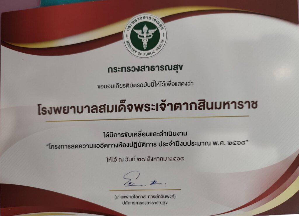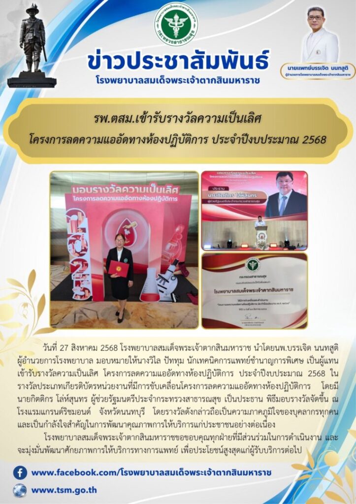 วันที่ 27 สิงหาคม 2568 โรงพยาบาลสมเด็จพระเจ้าตากสินมหาราช นำโดยนพ.บรรเจิด นนทสูติ ผู้อำนวยการโรงพยาบาล มอบหมายให้นางวิไล ปัททุม นักเทคนิคการแพทย์ชำนาญการพิเศษ เป็นผู้แทนเข้ารับรางวัลความเป็นเลิศ โครงการลดความแออัดทางห้องปฏิบัติการ ประจำปีงบประมาณ 2568 ในรางวัลประเภทเกียรติบัตรหน่วยงานที่มีการขับเคลื่อนโครงการลดความแออัดทางห้องปฏิบัติการ โดยมี นายกิตติกร โล่ห์สุนทร ผู้ช่วยรัฐมนตรีประจำกระทรวงสาธารณสุข เป็นประธาน พิธีมอบรางวัลจัดขึ้น ณ โรงแรมแกรนด์ริชมอนด์ จังหวัดนนทบุรี โดยรางวัลดังกล่าวถือเป็นความภาคภูมิใจของบุคลากรทุกคน และเป็นกำลังใจสำคัญในการพัฒนาคุณภาพการให้บริการแก่ประชาชนอย่างต่อเนื่อง