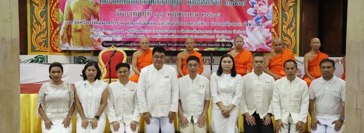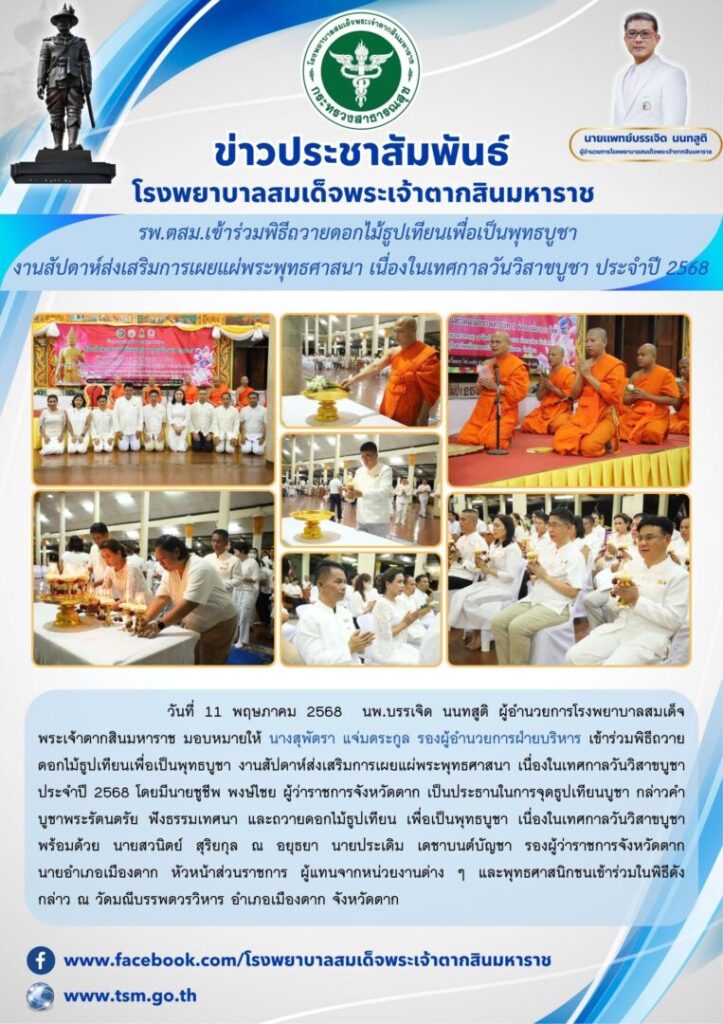 วันที่ 11 พฤษภาคม 2568 นพ.บรรเจิด นนทสูติ ผู้อำนวยการโรงพยาบาลสมเด็จพระเจ้าตากสินมหาราช มอบหมายให้ นางสุพัตรา แจ่มตระกูล รองผู้อำนวยการฝ่ายบริหาร เข้าร่วมพิธีถวายดอกไม้ธูปเทียนเพื่อเป็นพุทธบูชา งานสัปดาห์ส่งเสริมการเผยแผ่พระพุทธศาสนา เนื่องในเทศกาลวันวิสาขบูชา ประจำปี 2568 โดยมีนายชูชีพ พงษ์ไชย ผู้ว่าราชการจังหวัดตาก เป็นประธานในการจุดธูปเทียนบูชา กล่าวคำบูชาพระรัตนตรัย ฟังธรรมเทศนา และถวายดอกไม้ธูปเทียน เพื่อเป็นพุทธบูชา เนื่องในเทศกาลวันวิสาขบูชา พร้อมด้วย นายสวนิตย์ สุริยกุล ณ อยุธยา นายประเดิม เดชาบนต์บัญชา รองผู้ว่าราชการจังหวัดตาก นายอำเภอเมืองตาก หัวหน้าส่วนราชการ ผู้แทนจากหน่วยงานต่าง ๆ และพุทธศาสนิกชนเข้าร่วมในพิธีดังกล่าว ณ วัดมณีบรรพตวรวิหาร อำเภอเมืองตาก จังหวัดตาก