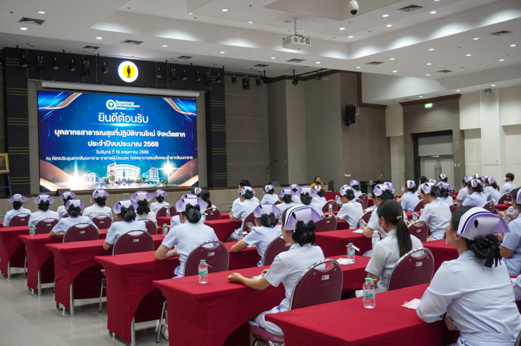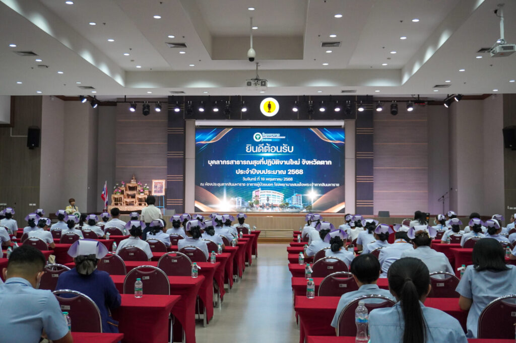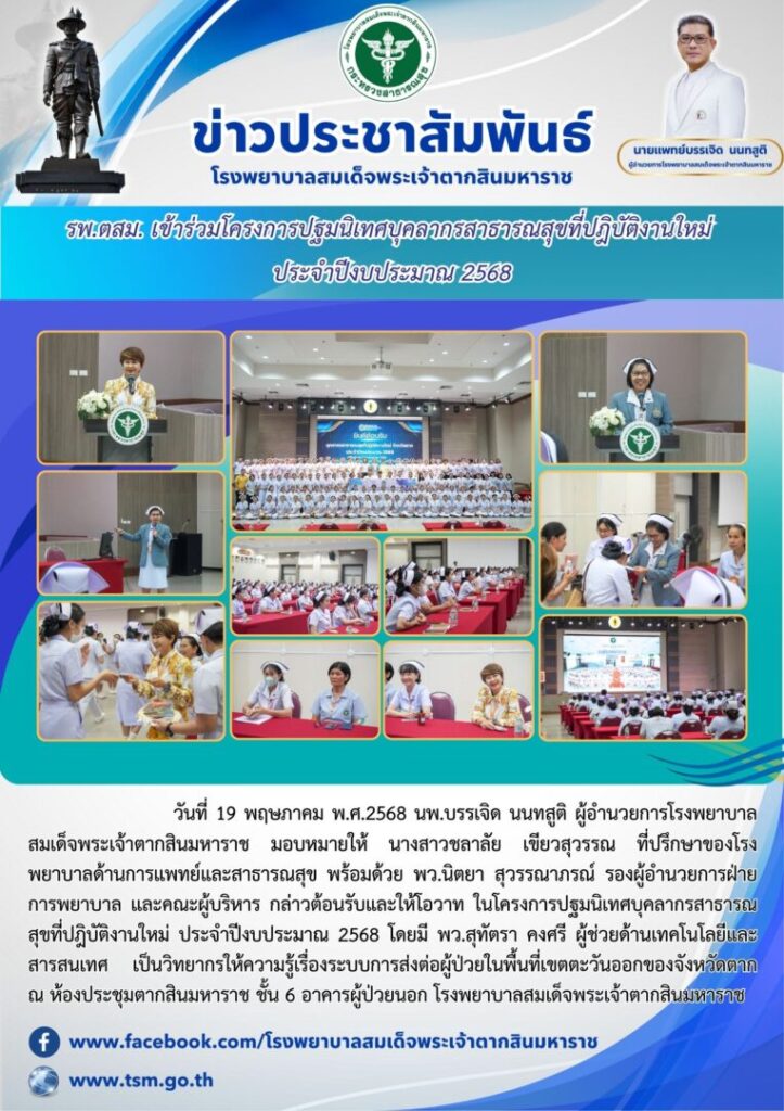 วันที่ 19 พฤษภาคม พ.ศ.2568 นพ.บรรเจิด นนทสูติ ผู้อำนวยการโรงพยาบาลสมเด็จพระเจ้าตากสินมหาราช มอบหมายให้ นางสาวชลาลัย เขียวสุวรรณ ที่ปรึกษาของโรงพยาบาลด้านการแพทย์และสาธารณสุข พร้อมด้วย พว.นิตยา สุวรรณาภรณ์ รองผู้อำนวยการฝ่ายการพยาบาล และคณะผู้บริหาร กล่าวต้อนรับและให้โอวาท ในโครงการปฐมนิเทศบุคลากรสาธารณสุขที่ปฎิบัติงานใหม่ ประจำปีงบประมาณ 2568 โดยมี พว.สุทัตรา คงศรี ผู้ช่วยด้านเทคโนโลยีและสารสนเทศ เป็นวิทยากรให้ความรู้เรื่องระบบการส่งต่อผู้ป่วยในพื้นที่เขตตะวันออกของจังหวัดตาก ณ ห้องประชุมตากสินมหาราช ชั้น 6 อาคารผู้ป่วยนอก โรงพยาบาลสมเด็จพระเจ้าตากสินมหาราช