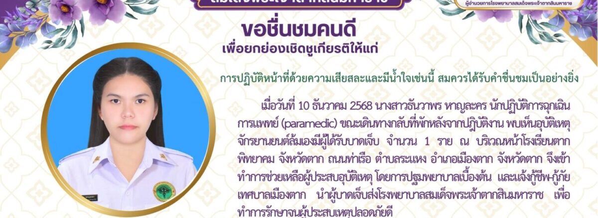 โรงพยาบาลสมเด็จพระเจ้าตากสินมหาราช ขอชื่นชมเพื่อยกย่องเชิดชูเกียรติแก่ พว.ธันวาพร หาญละคร นักปฏิบัติการฉุกเฉินการแพทย์ (paramedic) ในการช่วยเหลือผู้ป่วย ประสบอุบัติเหตุ บนท้องถนน เมื่อวันที่ 11 ธันวาคม 2568