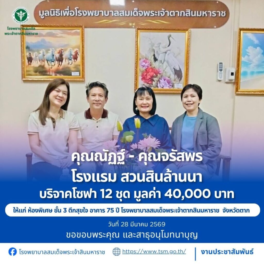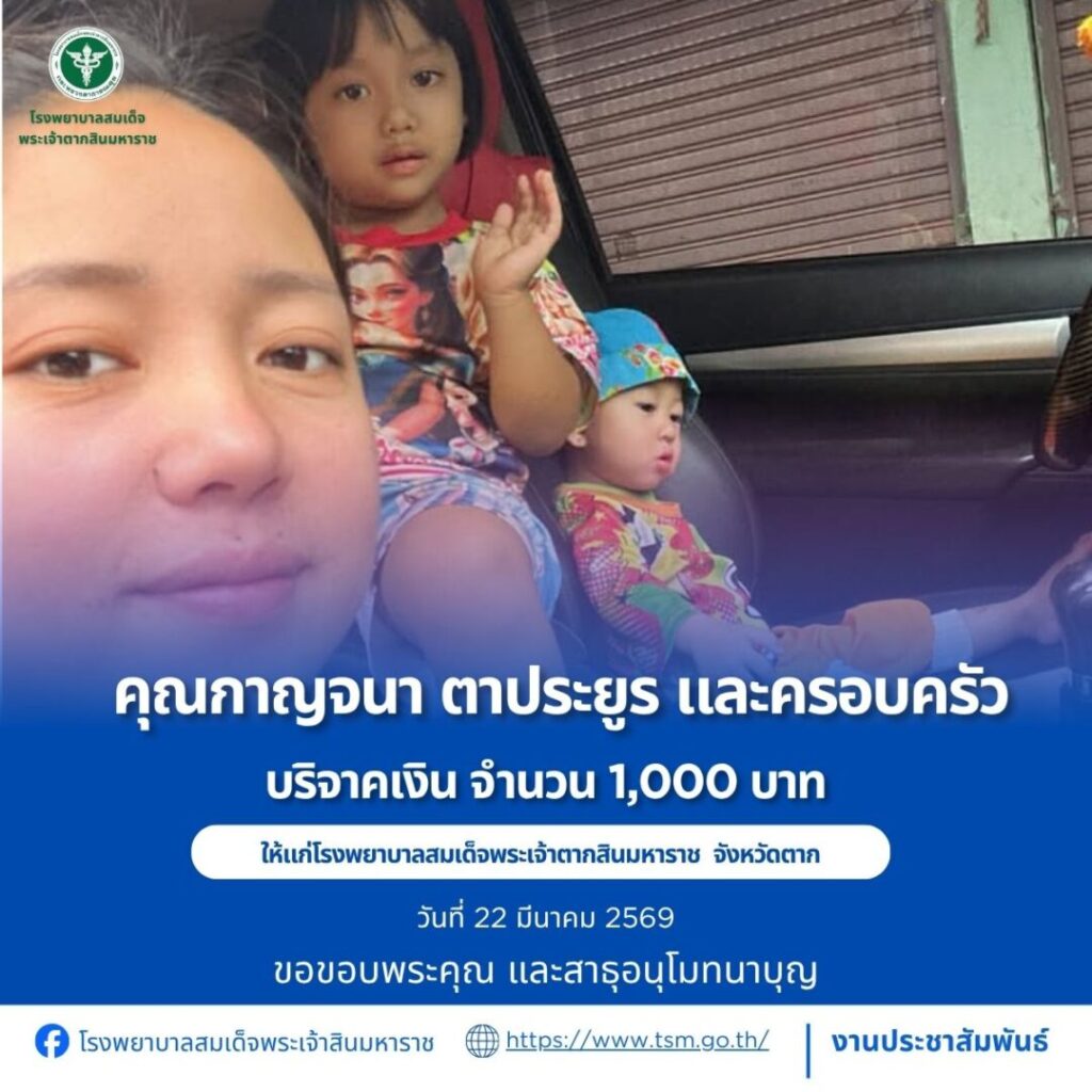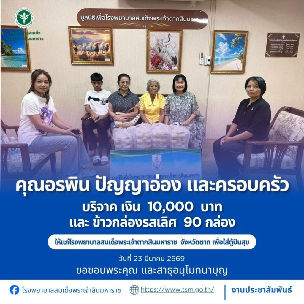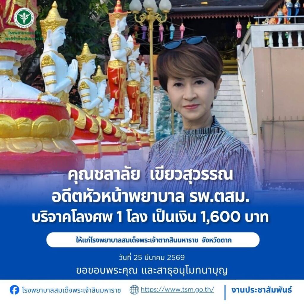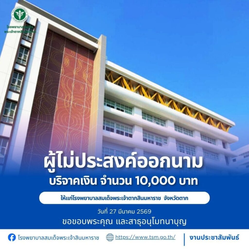 โรงพยาบาลสมเด็จพระเจ้าตากสินมหาราช ขอขอบพระคุณผู้บริจาคประจำวันที่ 22-31 มีนาคม 2569