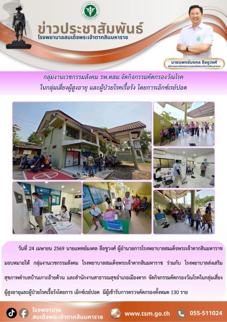 วันที่ 24 เมษายน 2569 นายแพทย์มงคล ลือชูวงศ์ ผู้อำนวยการโรงพยาบาลสมเด็จพระเจ้าตากสินมหาราช มอบหมายให้ กลุ่มงานเวชกรรมสังคม โรงพยาบาลสมเด็จพระเจ้าตากสินมหาราช ร่วมกับ โรงพยาบาลส่งเสริม สุขภาพตำบลบ้านเกาะอ้ายด้วน และสำนักงานสาธารณสุขอำเภอเมืองตาก จัดกิจกรรมคัดกรองวัณโรคในกลุ่มเสี่ยง ผู้สูงอายุและผู้ป่วยโรคเรื้อรังโดยการ เอ็กซ์เรย์ปอด มีผู้เข้ารับการตรวจคัดกรองทั้งหมด 130 ราย