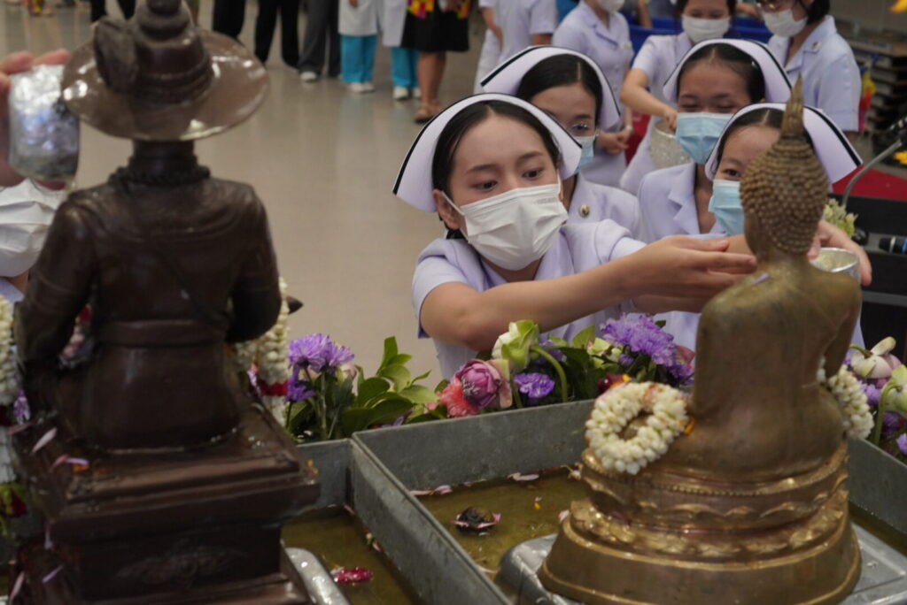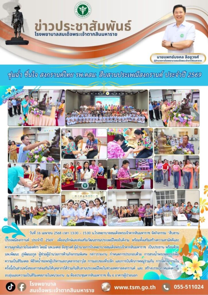 วันที่ 16 เมษายน 2568 เวลา 13.00 – 15.00 น.โรงพยาบาลสมเด็จพระเจ้าตากสินมหาราช จัดกิจกรรม “สืบสานประเพณีสงกรานต์ ประจำปี 2569” เพื่ออนุรักษ์และส่งเสริมวัฒนธรรมประเพณีไทยอันดีงาม พร้อมทั้งเสริมสร้างความสามัคคีและความผูกพันภายในองค์กร โดยมี นพ.มงคล ลือชูวงศ์ ผู้อำนวยการโรงพยาบาลสมเด็จพระเจ้าตากสินมหาราช เป็นประธาน พร้อมด้วยนพ.พัฒนะ ภู่พัฒนะกูล ผู้ช่วยผู้อำนวยการด้านกิจกรรมพิเศษ กล่าวรายงาน กำหนดการประกอบด้วย การสรงน้ำพระพุทธรูปเพื่อความเป็นสิริมงคล พิธีรดน้ำขอพรผู้บริหารและบุคลากรอาวุโส การมอบของที่ระลึก และการบันทึกภาพหมู่ร่วมกัน การจัดกิจกรรมในครั้งนี้เป็นส่วนหนึ่งของการส่งเสริมให้บุคลากรได้ร่วมกันสืบสานประเพณีไทยในช่วงเทศกาลสงกรานต์ และ สร้างบรรยากาศแห่งความอบอุ่นและความเป็นสิริมงคลภายในหน่วยงาน ณ ห้องประชุมตากสินมหาราช ชั้น 6 อาคารผู้ป่วยนอก