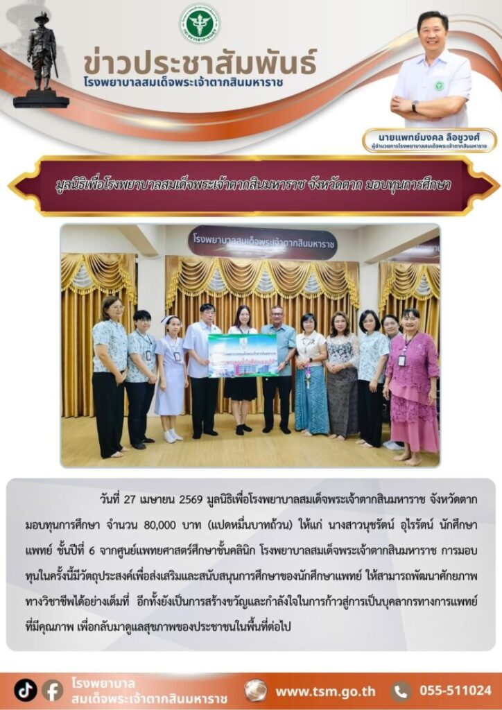 วันที่ 27 เมษายน 2569 มูลนิธิเพื่อโรงพยาบาลสมเด็จพระเจ้าตากสินมหาราช จังหวัดตาก มอบทุนการศึกษา จำนวน 80,000 บาท (แปดหมื่นบาทถ้วน) ให้แก่ นางสาวนุชรัตน์ อุไรรัตน์ นักศึกษาแพทย์ ชั้นปีที่ 6 จากศูนย์แพทยศาสตร์ศึกษาชั้นคลินิก โรงพยาบาลสมเด็จพระเจ้าตากสินมหาราช การมอบทุนในครั้งนี้มีวัตถุประสงค์เพื่อส่งเสริมและสนับสนุนการศึกษาของนักศึกษาแพทย์ ให้สามารถพัฒนาศักยภาพทางวิชาชีพได้อย่างเต็มที่ อีกทั้งยังเป็นการสร้างขวัญและกำลังใจในการก้าวสู่การเป็นบุคลากรทางการแพทย์ที่มีคุณภาพ เพื่อกลับมาดูแลสุขภาพของประชาชนในพื้นที่ต่อไป