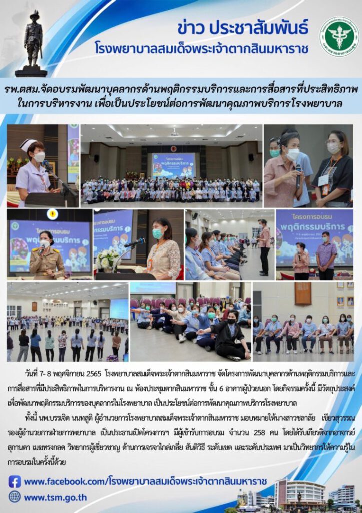 วันที่ 7- 8 พฤศจิกายน 2565 โรงพยาบาลสมเด็จพระเจ้าตากสินมหาราช จัดโครงการพัฒนาบุคลากรด้านพฤติกรรมบริการและการสื่อสารที่มีประสิทธิภาพในการบริหารงาน ณ ห้องประชุมตากสินมหาราช ชั้น 6 อาคารผู้ป่วยนอก โดยกิจรรมครั้งนี้ มีวัตถุประสงค์เพื่อพัฒนาพฤติกรรมบริการของบุคลากรในโรงพยาบาล เป็นประโยชน์ต่อการพัฒนาคุณภาพบริการโรงพยาบาล