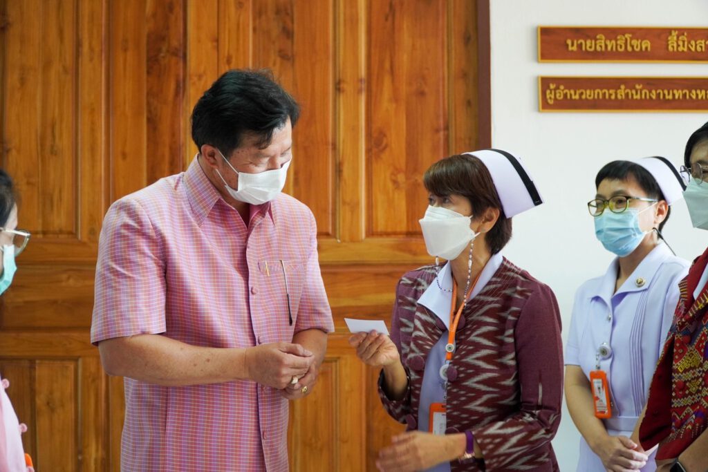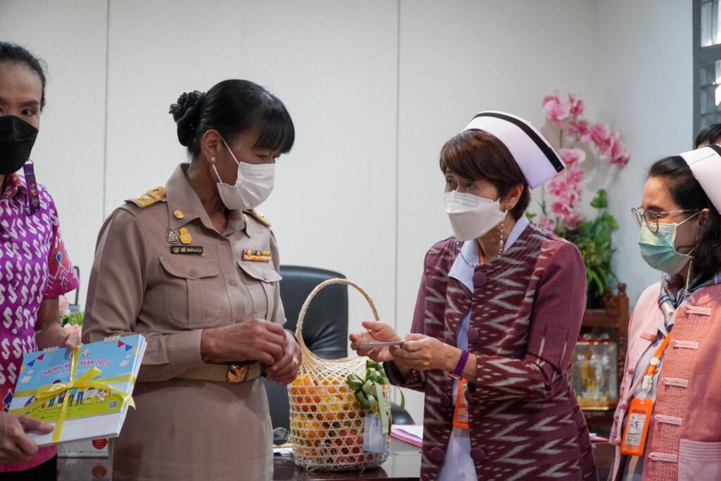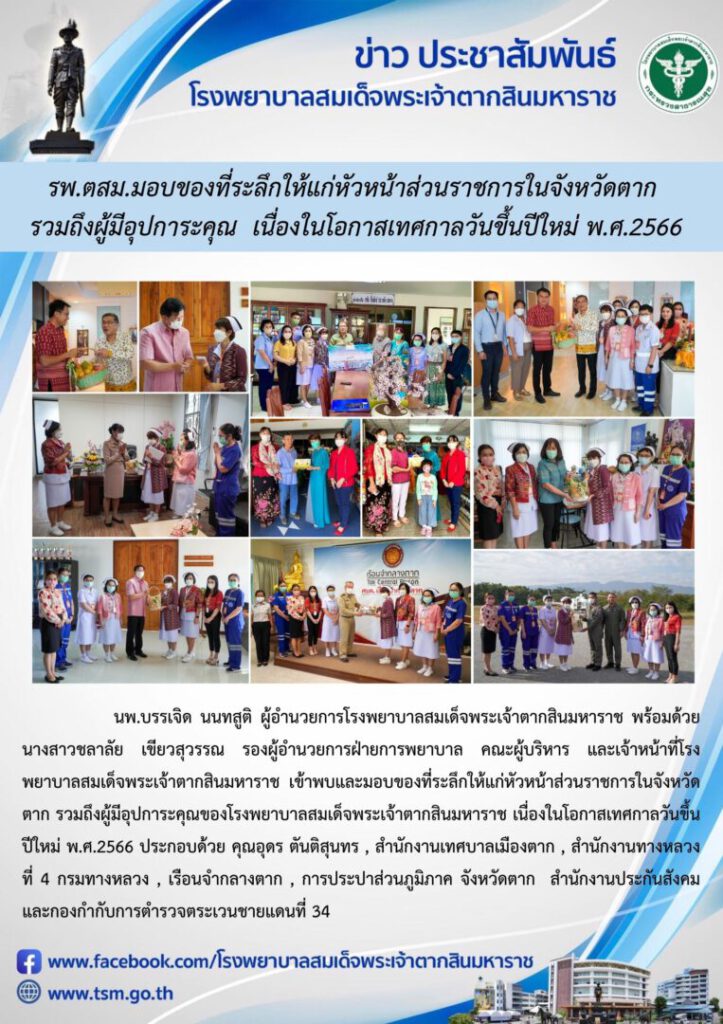นพ.บรรเจิด นนทสูติ ผู้อำนวยการโรงพยาบาลสมเด็จพระเจ้าตากสินมหาราช พร้อมด้วย นางสาวชลาลัย เขียวสุวรรณ รองผู้อำนวยการฝ่ายการพยาบาล คณะผู้บริหาร และเจ้าหน้าที่โรงพยาบาลสมเด็จพระเจ้าตากสินมหาราช เข้าพบและมอบของที่ระลึกให้แก่หัวหน้าส่วนราชการในจังหวัดตาก รวมถึงผู้มีอุปการะคุณของโรงพยาบาลสมเด็จพระเจ้าตากสินมหาราช เนื่องในโอกาสเทศกาลวันขึ้นปีใหม่ พ.ศ.2566 ประกอบด้วย คุณอุดร ตันติสุนทร , สำนักงานเทศบาลเมืองตาก , สำนักงานทางหลวงที่ 4 กรมทางหลวง , เรือนจำกลางตาก , การประปาส่วนภูมิภาค จังหวัดตาก , สำนักงานประกันสังคม และกองกำกับการตำรวจตระเวนชายแดนที่ 34