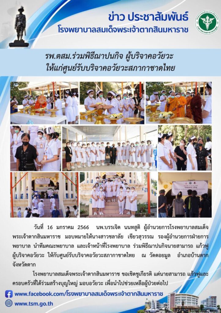 วันที่ 16 มกราคม 2566 นพ.บรรเจิด นนทสูติ ผู้อำนวยการโรงพยาบาลสมเด็จพระเจ้าตากสินมหาราช มอบหมายให้นางสาวชลาลัย เขียวสุวรรณ รองผู้อำนวยการฝ่ายการพยาบาล นำทีมคณะพยาบาล และเจ้าหน้าที่โรงพยาบาล ร่วมพิธีฌาปนกิจนายสามารถ แก้วฟู ผู้บริจาคอวัยวะ ให้กับศูนย์รับบริจาคอวัยวะสภากาชาดไทย ณ วัดดอยมูล อำเภอบ้านตาก จังหวัดตาก