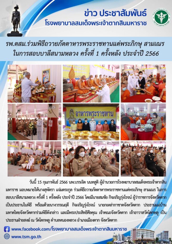 วันนี้ 15 กุมภาพันธ์ 2566 นพ.บรรเจิด นนทสูติ ผู้อำนวยการโรงพยาบาลสมเด็จพระเจ้าตากสินมหาราช มอบหมายให้นางสุพัตรา แจ่มตระกูล ร่วมพิธีถวายภัตตาหารพระราชทานแด่พระภิกษุ สามเณร ในการสอบบาลีสนามหลวง ครั้งที่ 1 ครั้งหลัง ประจำปี 2566 โดยมีนายสมชัย กิจเจริญรุ่งโรจน์ ผู้ว่าราชการจังหวัดตาก เป็นประธานในพิธี พร้อมด้วยนางวรรณฤดี กิจเจริญรุ่งโรจน์ นายกเหล่ากาชาดจังหวัดตาก ประธานแม่บ้านมหาดไทยจังหวัดตากร่วมพิธีดังกล่าว และมีพระประสิทธิศีลคุณ เจ้าคณะจังหวัดตาก เจ้าอาวาสวัดโคกพลู เป็นประธานฝ่ายสงฆ์ ณ วัดโคกพลู ตำบลหนองหลวง อำเภอเมืองตาก จังหวัดตาก