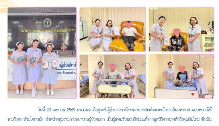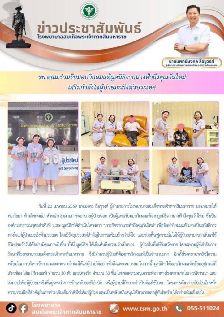 วันที่ 20 เมษายน 2569 นพ.มงคล ลือชูวงศ์ ผู้อำนวยการโรงพยาบาลสมเด็จพระเจ้าตากสินมหาราช มอบหมายให้ พว.กัลยา ท้วมโคกหม้อ หัวหน้ากลุ่มงานการพยาบาลผู้ป่วยนอก เป็นผู้แทนรับมอบวิกผมแท้จากมูลนิธิจากนางฟ้าถึงคุณวันใหม่ ซึ่งเป็นองค์กรสาธารณกุศลลำดับที่ 1,006 มูลนิธิฯได้ดำเนินโครงการ “ภารกิจจากนางฟ้าถึงคุณวันใหม่” เพื่อจัดทำวิกผมแท้ มอบเป็นสวัสดิการทางใจแก่ผู้ป่วยมะเร็งทั่วประเทศ โดยมีวัตถุประสงค์สำคัญในการเสริมสร้างกำลังใจ และช่วยฟื้นฟูความมั่นใจให้ผู้ป่วยสามารถกลับมาใช้ชีวิตประจำวันได้อย่างมีคุณภาพยิ่งขึ้น ทั้งนี้ มูลนิธิฯ ได้เล็งเห็นถึงความจำเป็นของ ผู้ป่วยในพื้นที่จังหวัดตาก โดยเฉพาะผู้ที่เข้ารับการรักษาที่โรงพยาบาลสมเด็จพระเจ้าตากสินมหาราช ซึ่งมีจำนวนผู้ป่วยที่ต้องการวิกผมแท้เป็นจำนวนมาก อีกทั้งโรงพยาบาลยังมีความพร้อมในการบริหารจัดการ และกระจายวิกผมให้แก่ผู้ป่วยได้อย่างทั่วถึงและเหมาะสม ในการนี้ มูลนิธิฯ ได้มอบวิกผมแท้พร้อมอุปกรณ์ที่เกี่ยวข้อง ได้แก่ วิกผมแท้ จำนวน 30 หัว และโครงวิก จำนวน 30 ชิ้น โดยขอความอนุเคราะห์จากทางโรงพยาบาลในการพิจารณา และส่งมอบให้แก่ผู้ป่วยมะเร็งที่อยู่ระหว่างการรักษาด้วยเคมีบำบัด หรือผู้ป่วยที่มีความจำเป็นต้องใช้วิกผม โครงการดังกล่าวนับเป็นอีกหนึ่งความร่วมมือที่สำคัญในการช่วยเติมเต็มกำลังใจให้แก่ผู้ป่วย และเป็นพลังสนับสนุนให้สามารถต่อสู้กับโรคร้ายได้อย่างเข้มแข็งต่อไป