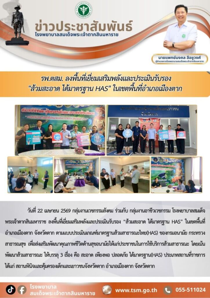 วันที่ 22 เมษายน 2569 กลุ่มงานเวชกรรมสังคม ร่วมกับ กลุ่มงานอาชีวเวชกรรม โรงพยาบาลสมเด็จพระเจ้าตากสินมหาราช ลงพื้นที่เยี่ยมเสริมพลังและประเมินรับรอง “ส้วมสะอาด ได้มาตรฐาน HAS” ในเขตพื้นที่อำเภอเมืองตาก จังหวัดตาก ตามแบบประเมินเกณฑ์มาตรฐานส้วมสาธารณะไทย(HAS) ของกรมอนามัย กระทรวงสาธารณสุข เพื่อส่งเสริมพัฒนาคุณภาพชีวิตด้านสุขอนามัยให้แก่ประชาชนในการใช้บริการส้วมสาธารณะ โดยเน้นพัฒนาส้วมสาธารณะ ให้บรรลุ 3 เรื่อง คือ สะอาด เพียงพอ ปลอดภัย ได้มาตรฐาน(HAS) ประเภทสถานที่ราชการ ได้แก่ สถานพินิจและคุ้มครองเด็กและเยาวชนจังหวัดตาก อำเภอเมืองตาก จังหวัดตา