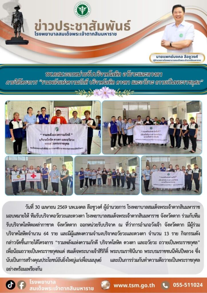วันที่ 30 เมษายน 2569 นพ.มงคล ลือชูวงศ์ ผู้อำนวยการ โรงพยาบาลสมเด็จพระเจ้าตากสินมหาราช มอบหมายให้ ทีมรับบริจาคอวัยวะและดวงตา โรงพยาบาลสมเด็จพระเจ้าตากสินมหาราช จังหวัดตาก ร่วมกับทีมรับบริจาคโลหิตเหล่ากาชาด จังหวัดตาก ออกหน่วยรับบริจาค ณ ที่ว่าการอำเภอวังเจ้า จังหวัดตาก มีผู้ร่วมบริจาคโลหิตจำนวน 64 ราย และมีผู้แสดงความจำนงบริจาคอวัยวะและดวงตา จำนวน 13 ราย กิจกรรมดังกล่าวจัดขึ้นภายใต้โครงการ “รวมพลังแห่งความภักดี บริจาคโลหิต ดวงตา และอวัยวะ ถวายเป็นพระราชกุศล” เพื่อน้อมถวายเป็นพระราชกุศลแด่ สมเด็จพระนางเจ้าสิริกิติ์ พระบรมราชินีนาถ พระบรมราชชนนีพันปีหลวง ซึ่งนับเป็นการสร้างคุณประโยชน์อันยิ่งใหญ่แก่เพื่อนมนุษย์ และเป็นการร่วมกันทำความดีถวายเป็นพระราชกุศล อย่างพร้อมเพรียงกัน ![]()