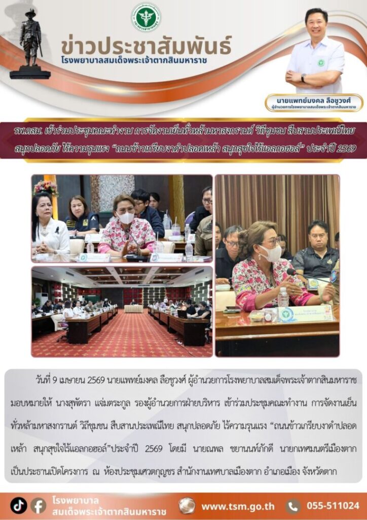 วันที่ 9 เมษายน 2569 นายแพทย์มงคล ลือชูวงศ์ ผู้อำนวยการโรงพยาบาลสมเด็จพระเจ้าตากสินมหาราช มอบหมายให้ นางสุพัตรา แจ่มตระกูล รองผู้อำนวยการฝ่ายบริหาร เข้าร่วมประชุมคณะทำงาน การจัดงานเย็น ทั่วหล้ามหาสงกรานต์ วิถีชุมชน สืบสานประเพณีไทย สนุกปลอดภัย ไร้ความรุนแรง “ถนนข้าวเกรียบงาดำปลอดเหล้า สนุกสุขใจไร้แอลกอฮอล์”ประจำปี 2569 โดยมี นายณพล ชยานนท์ภักดี นายกเทศมนตรีเมืองตาก เป็นประธานเปิดโครงการ ณ ห้องประชุมเศวตกุญชร สำนักงานเทศบาลเมืองตาก อำเภอเมือง จังหวัดตาก