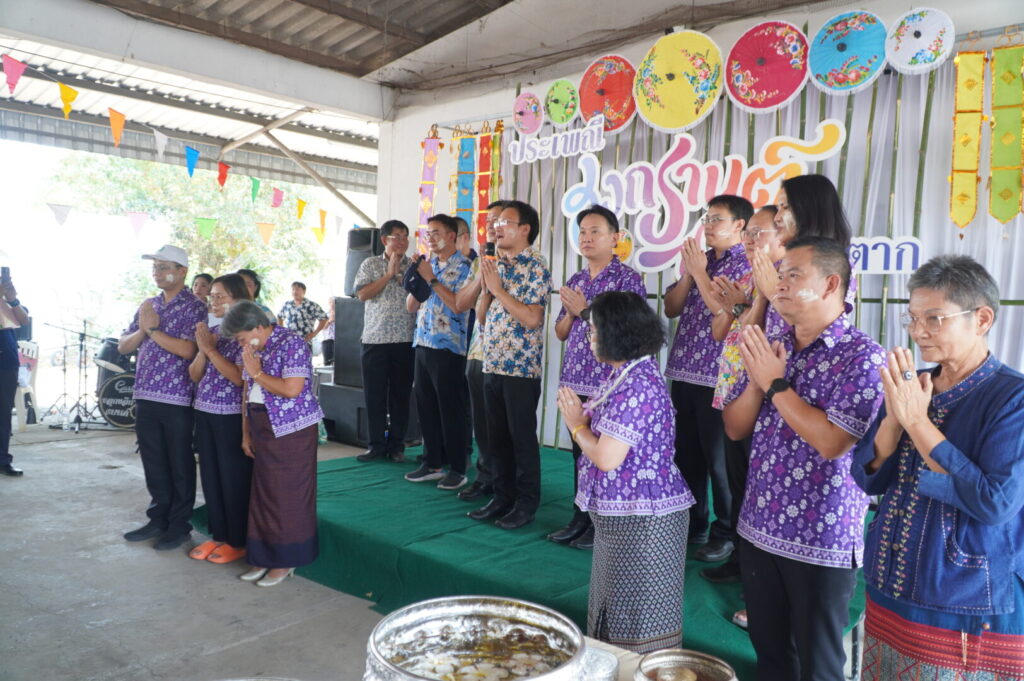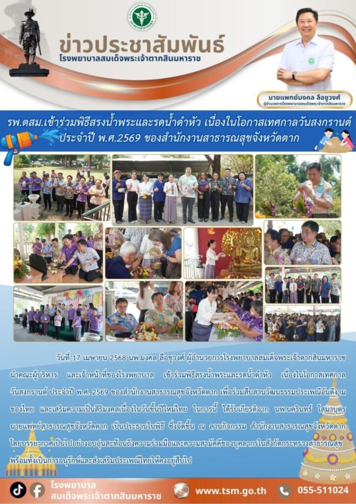 วันที่ 17 เมษายน 2568 นพ.มงคล ลือชูวงศ์ ผู้อำนวยการโรงพยาบาลสมเด็จพระเจ้าตากสินมหาราช นำคณะผู้บริหาร และเจ้าหน้าที่ของโรงพยาบาล เข้าร่วมพิธีสรงน้ำพระและรดน้ำดำหัว เนื่องในโอกาสเทศกาล วันสงกรานต์ ประจำปี พ.ศ. 2569 ของสำนักงานสาธารณสุขจังหวัดตาก เพื่อร่วมสืบสานวัฒนธรรมประเพณีอันดีงามของไทย และเสริมความเป็นสิริมงคลเนื่องในวันขึ้นปีใหม่ไทย ในการนี้ ได้รับเกียรติจาก นพ.นครินทร์ โสมาบุตร นายแพทย์สาธารณสุขจังหวัดตาก เป็นประธานในพิธี ซึ่งจัดขึ้น ณ ลานกิจกรรม สำนักงานสาธารณสุขจังหวัดตาก โดยบรรยากาศเป็นไปอย่างอบอุ่นสะท้อนถึงความร่วมมือและความสามัคคีของบุคลากรในสังกัดกระทรวงสาธารณสุข พร้อมทั้งเป็นการอนุรักษ์และส่งเสริมประเพณีไทยให้คงอยู่สืบไป